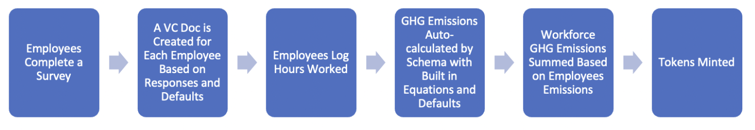 The workflow begins with each employee completing a survey to help refine their GHG estimates based on location; actual office, heating, and cooling equipment; and other important variables. Based on the responses, a verified credentials (VC) document is created. Then, employees track hours worked and GHG emissions are auto-calculated by customized schemas featuring built-in equations, defaults, and emission factors. Workforce emissions are calculated as the sum of all employee emissions and the resulting emissions are tokenized.