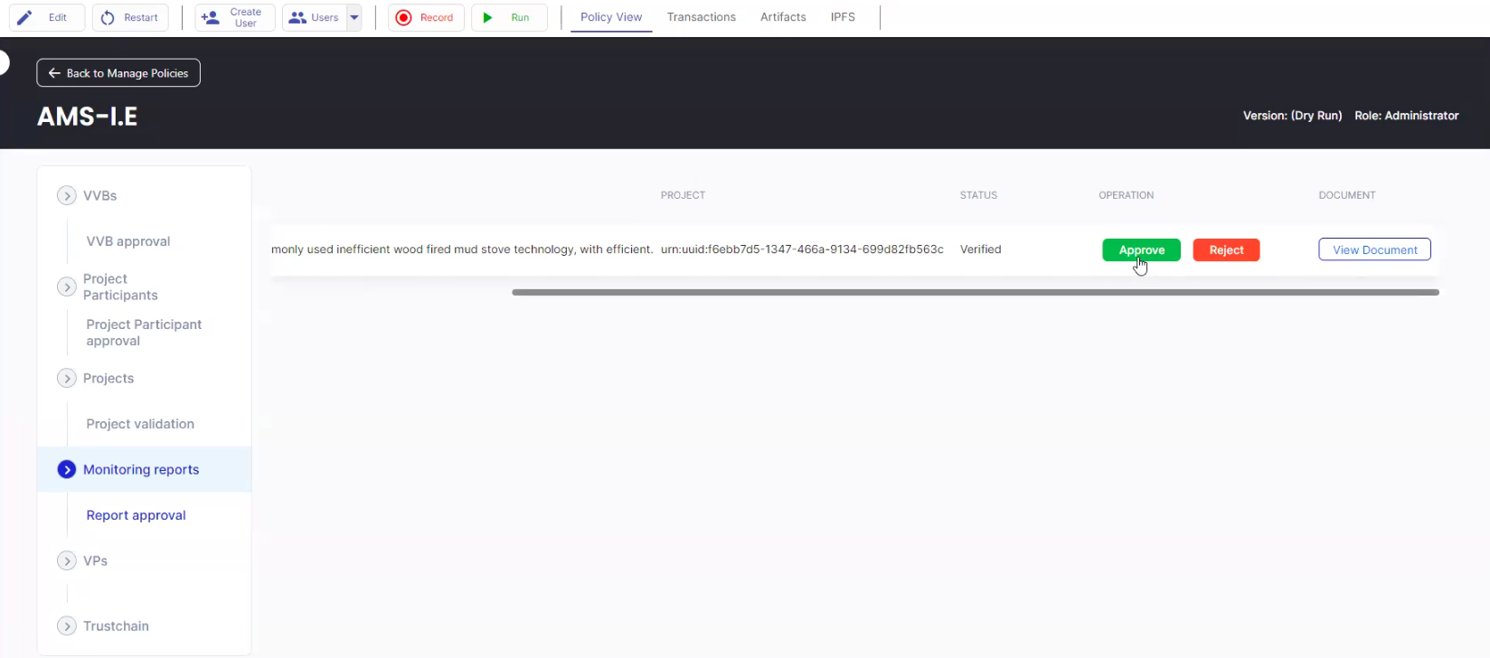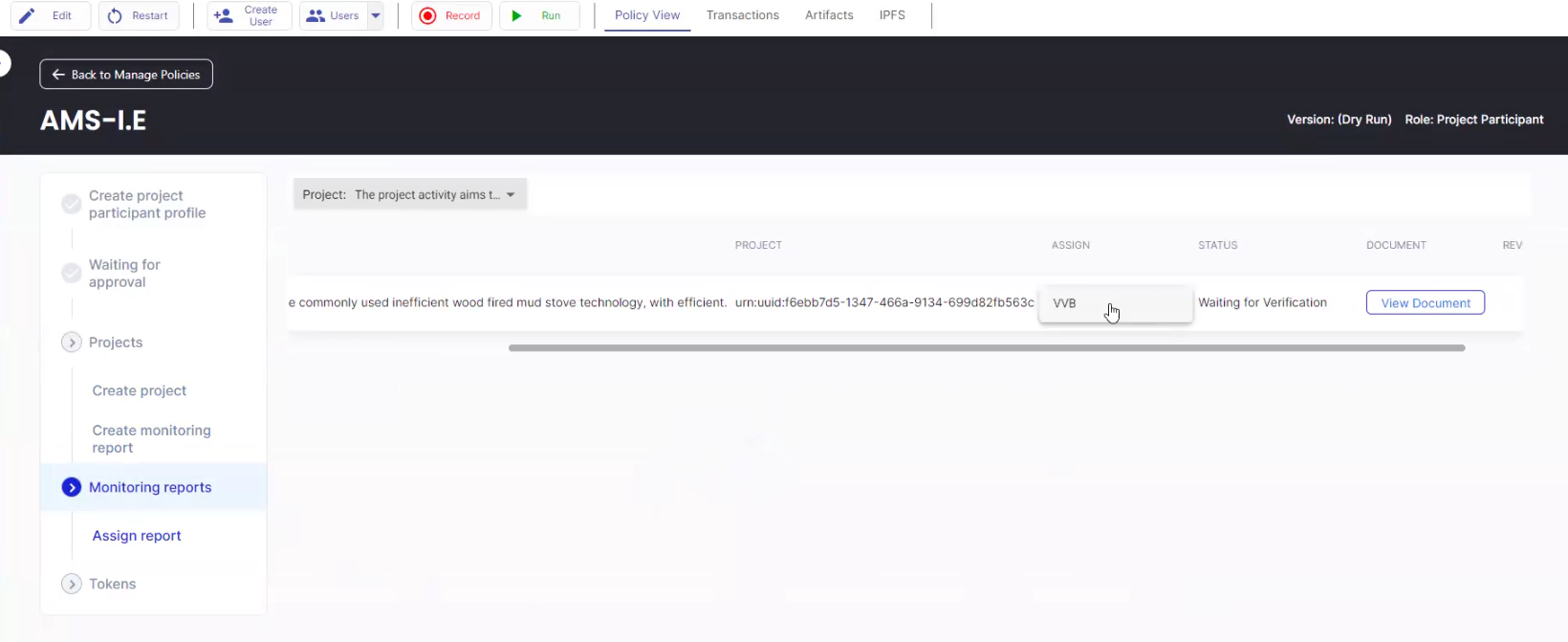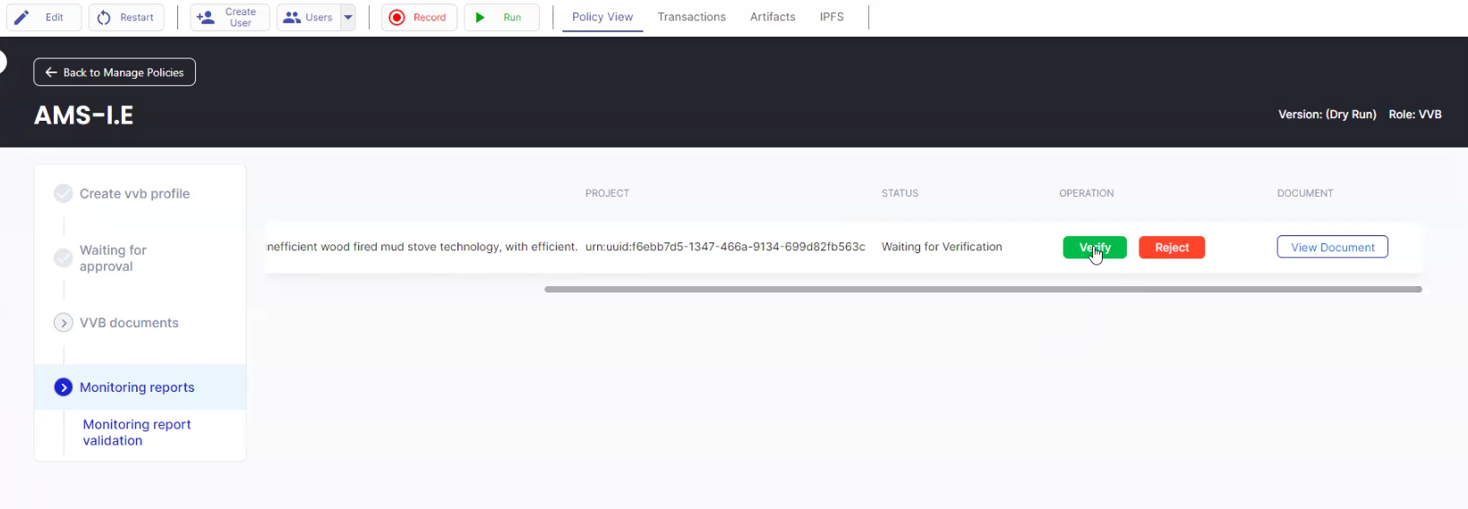 12. Log in as the VVB and click the “Monitoring Reports” tab to review the document submitted by the Project Participant. After reviewing the monitoring report by selecting “View Document”, the VVB can select “Verify”.\