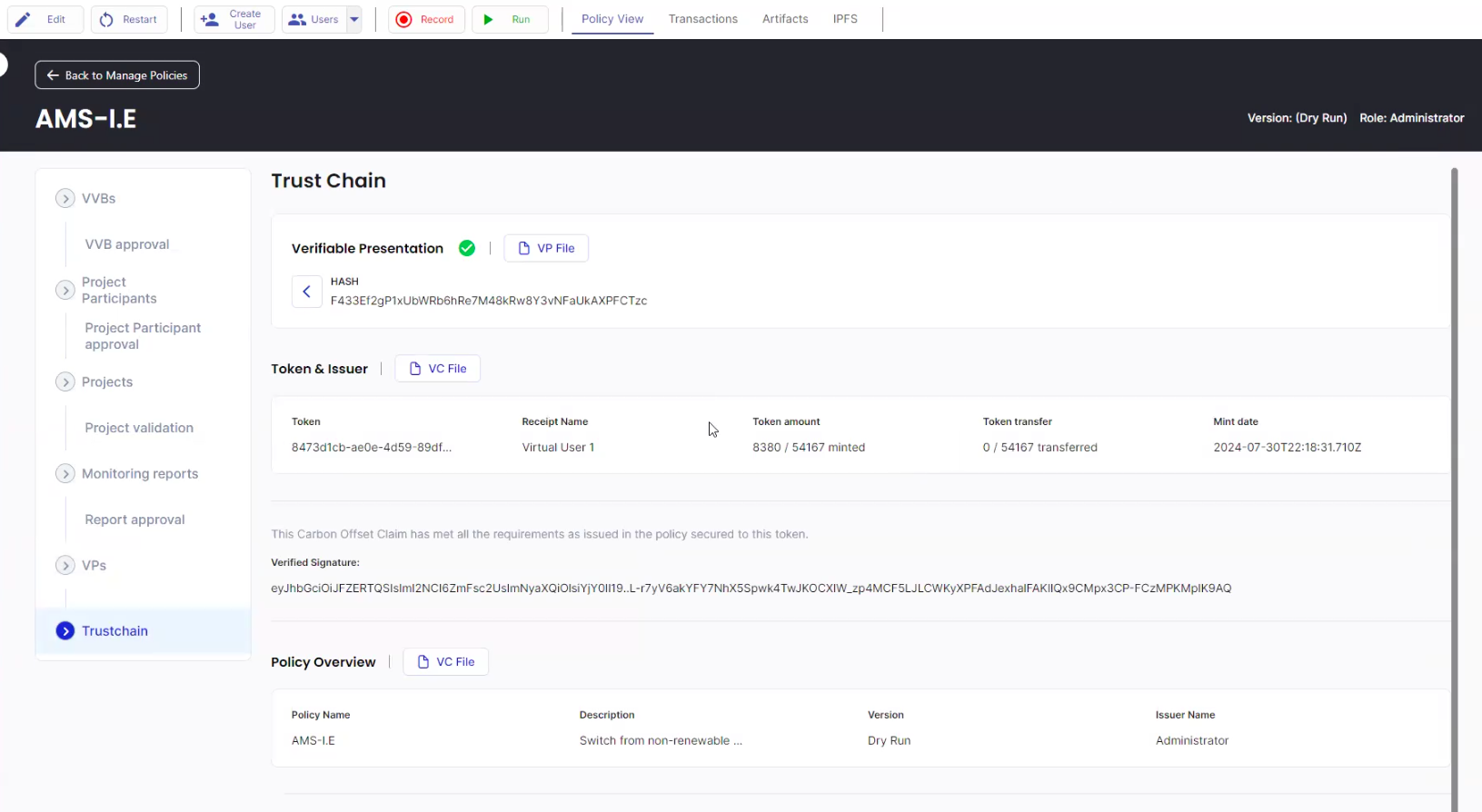This policy is published to Hedera network and can either be imported via Github (.policy file) or IPFS timestamp.
