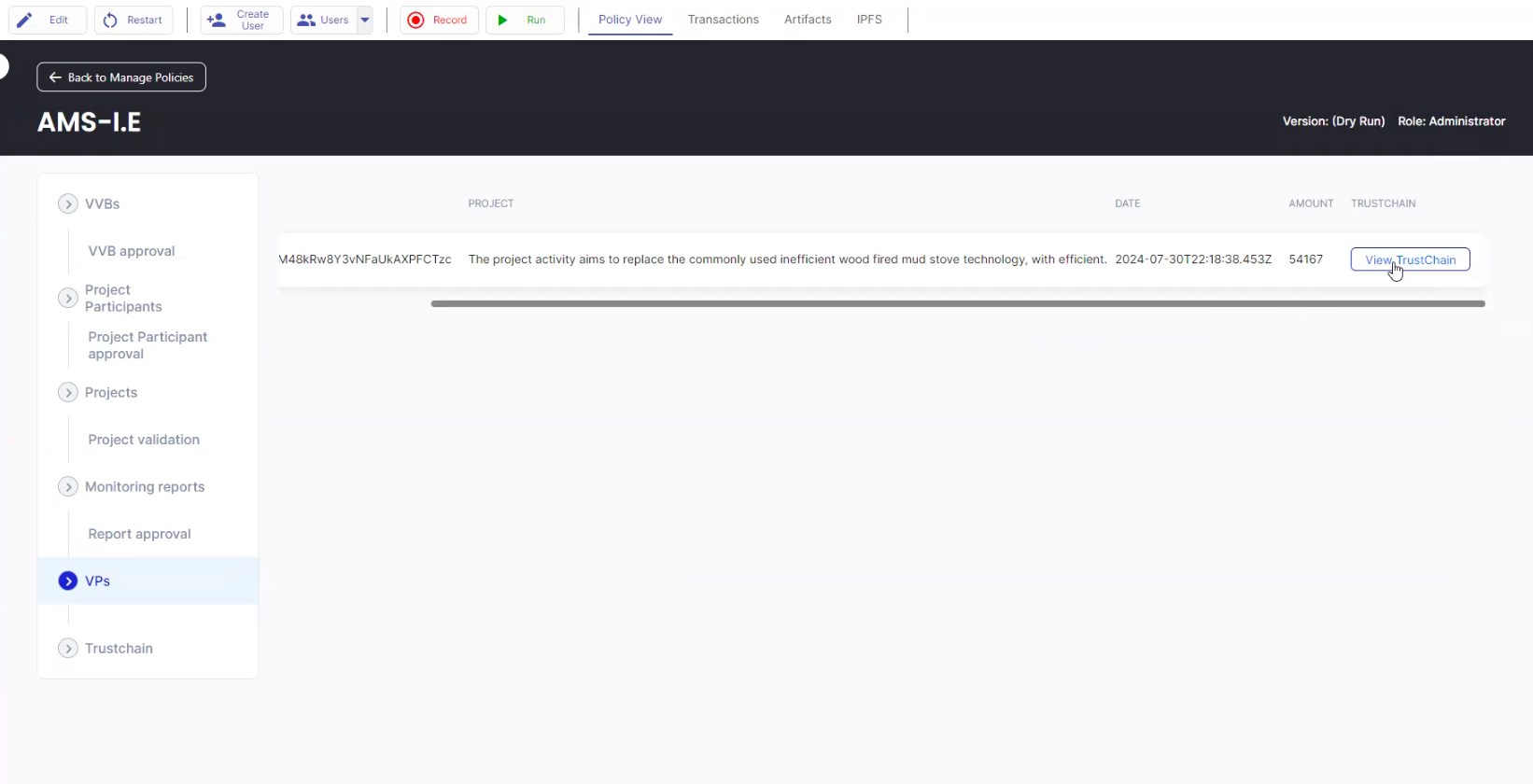 7. Log in as the SR and select the “Project Participants” or the “VVBs” tab to view the documents submitted by the Project Participant and by the VVB. The SR can approve their requests by clicking on the “Approve" button.