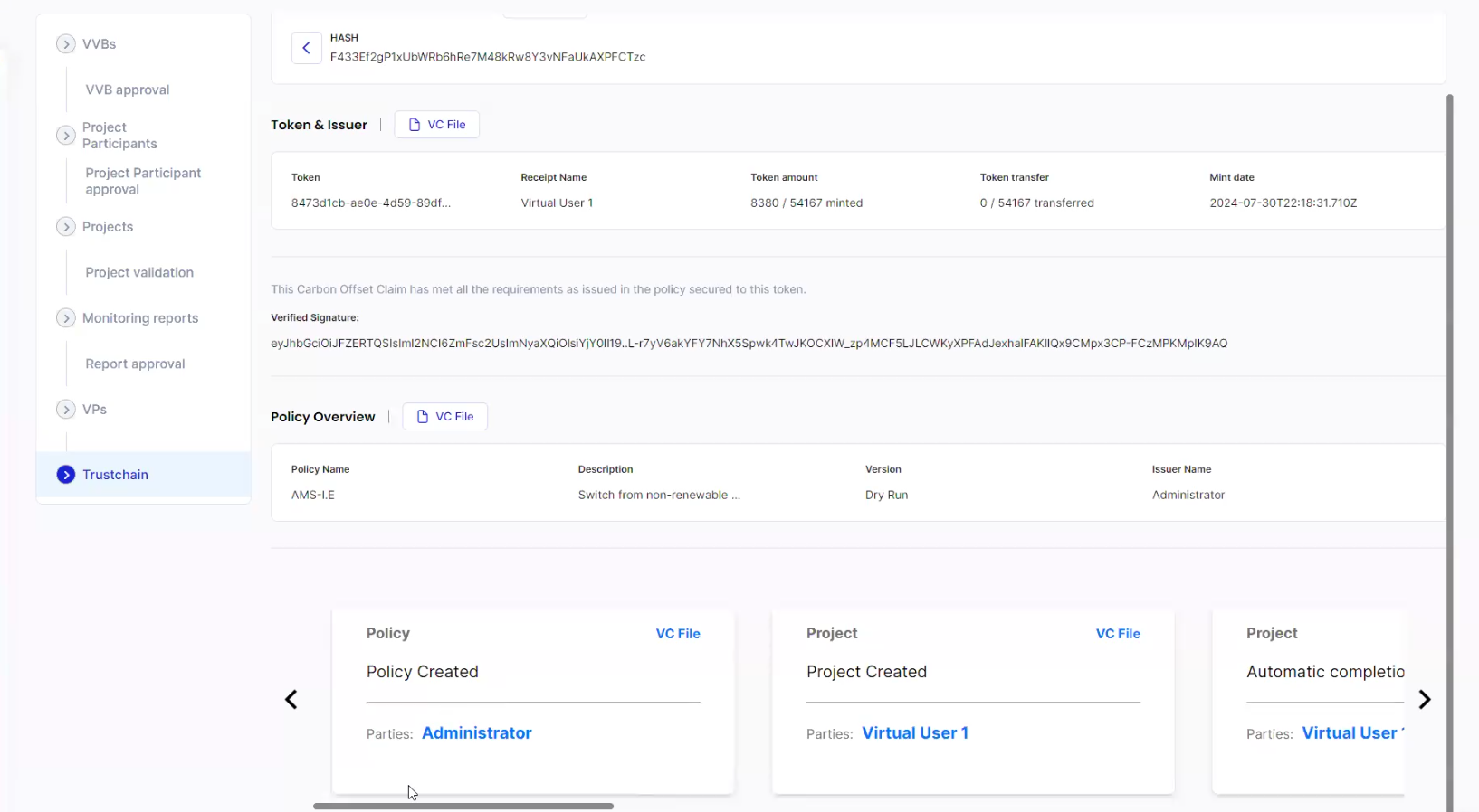 * Registry (UNFCCC) - The United Nations Framework Convention on Climate Change (UNFCCC) serves as the registry for the CDM. They oversee the multiple workflow steps involved in the project's approval, including the verification and validation process by the VVB. The UNFCCC's approval is necessary for the project's successful registration and issuance of CER tokens.