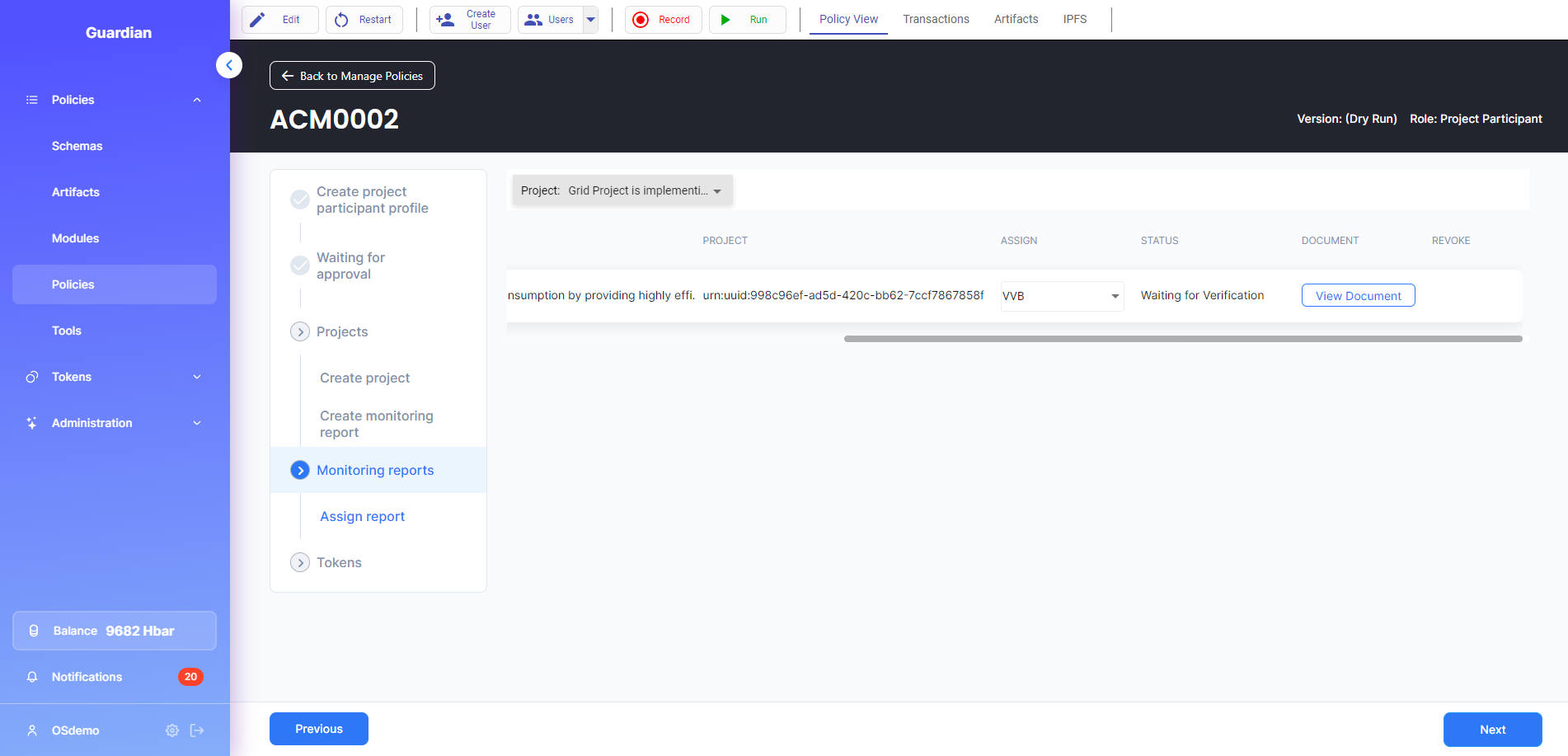 11. After creating the monitoring report, the project participant assigns the VVB to verify it by navigating to the “Monitoring Reports” tab and selecting the dropdown under “Assign”.