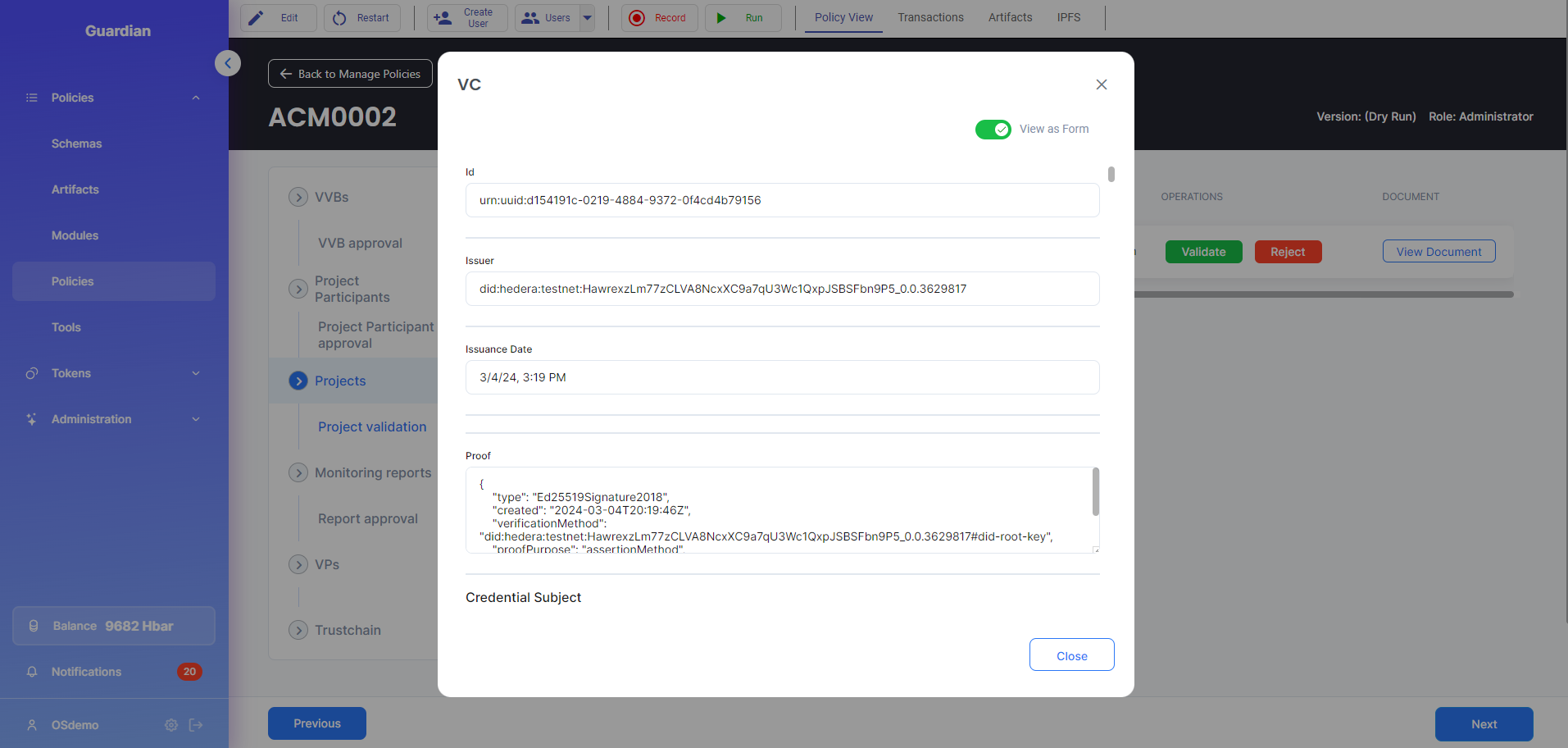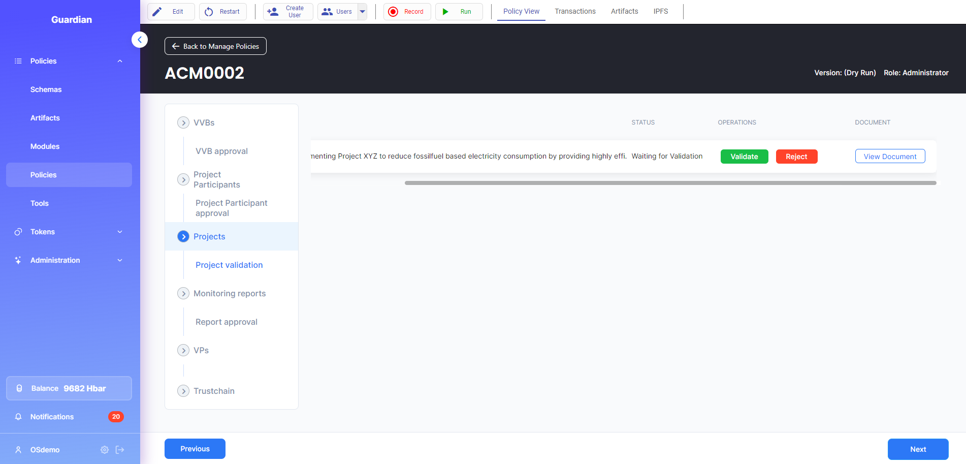 9. Log back in as the SR and after reviewing the document by selecting the “View Document” button, the SR can validate the project submitted by the Project Participant by clicking the “Validate” button. If the data does not satisfy the rules set by the SR, then the “Reject” button can be used.