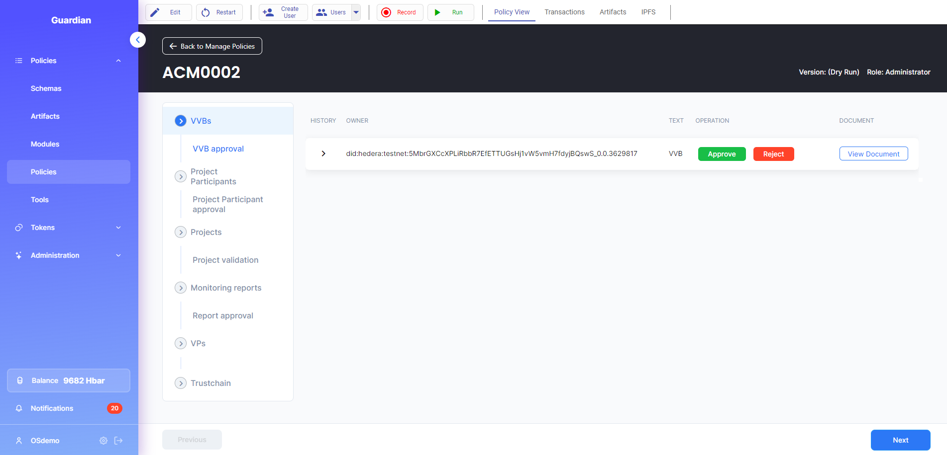 7. Log in as the SR and select the “Project Participants” or the “VVBs” tab to view the documents submitted by the Project Participant and by the VVB. The SR can approve their requests by clicking on the “Approve" button.