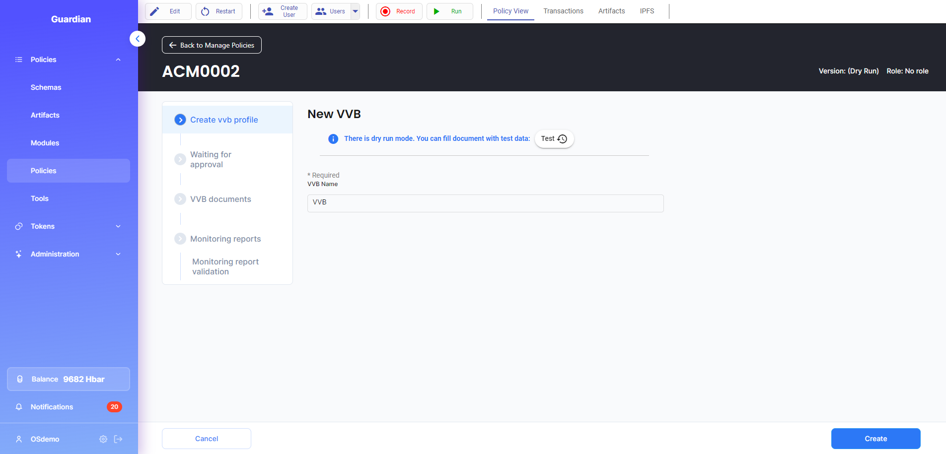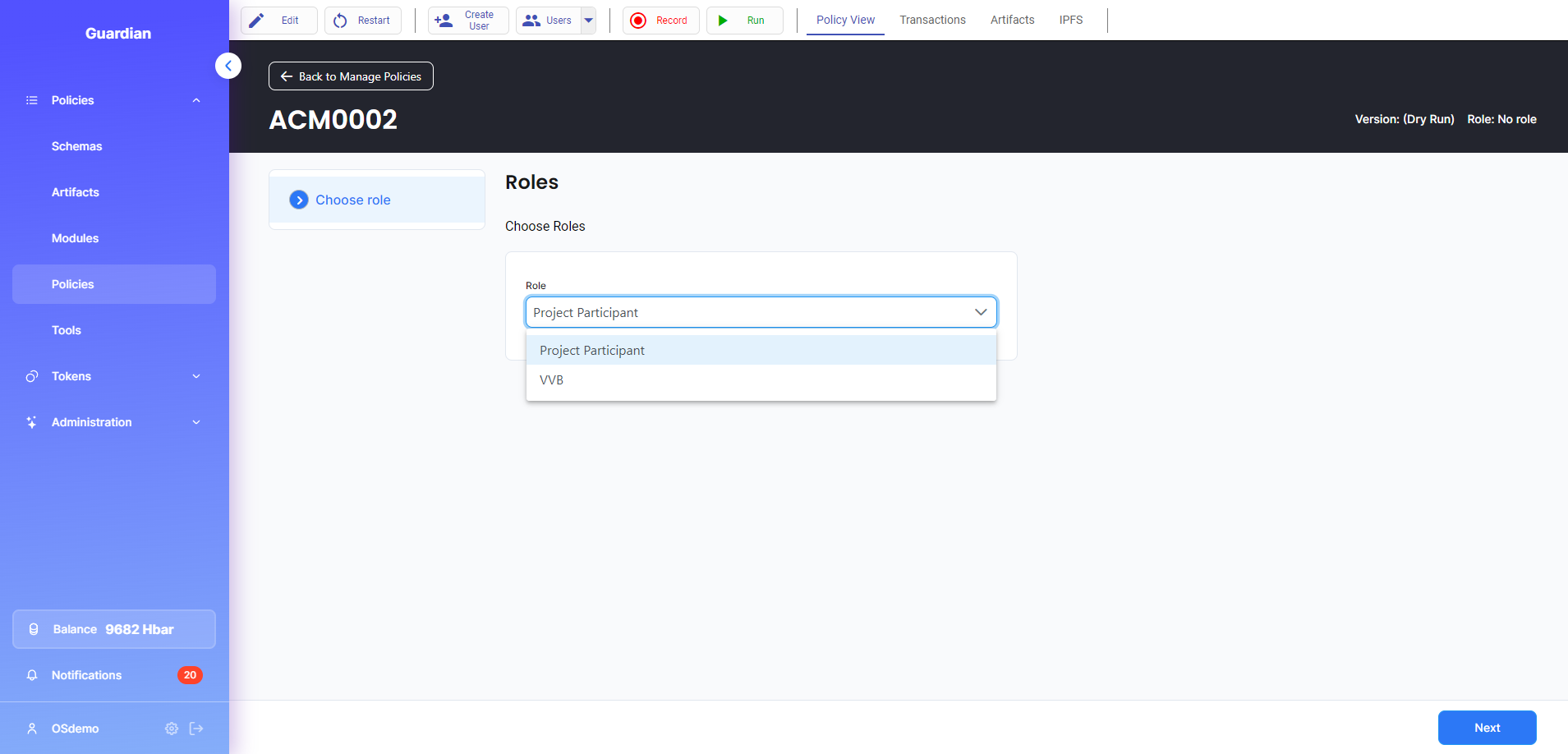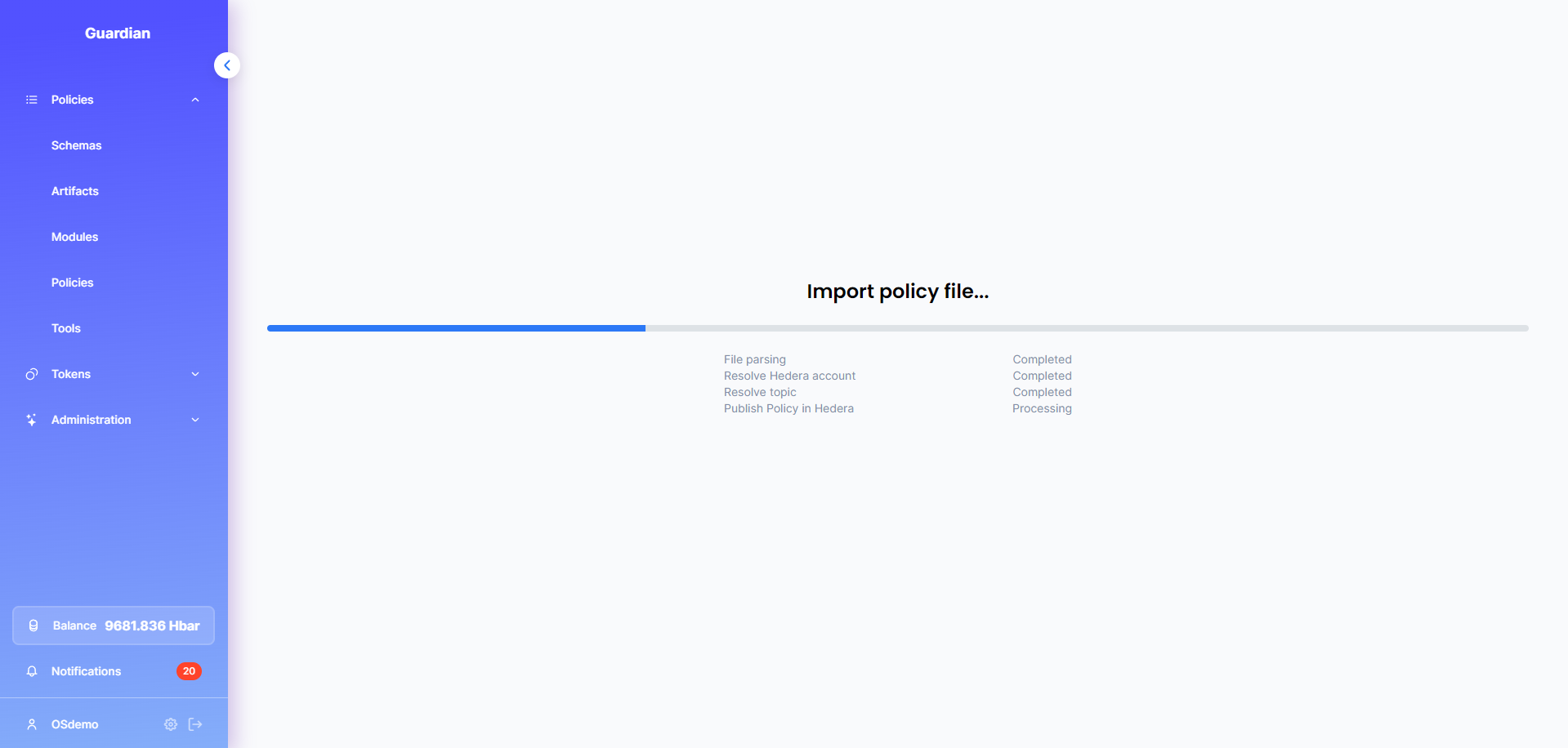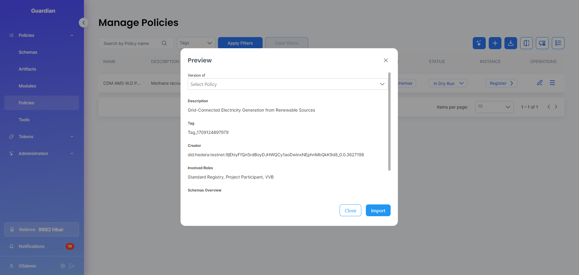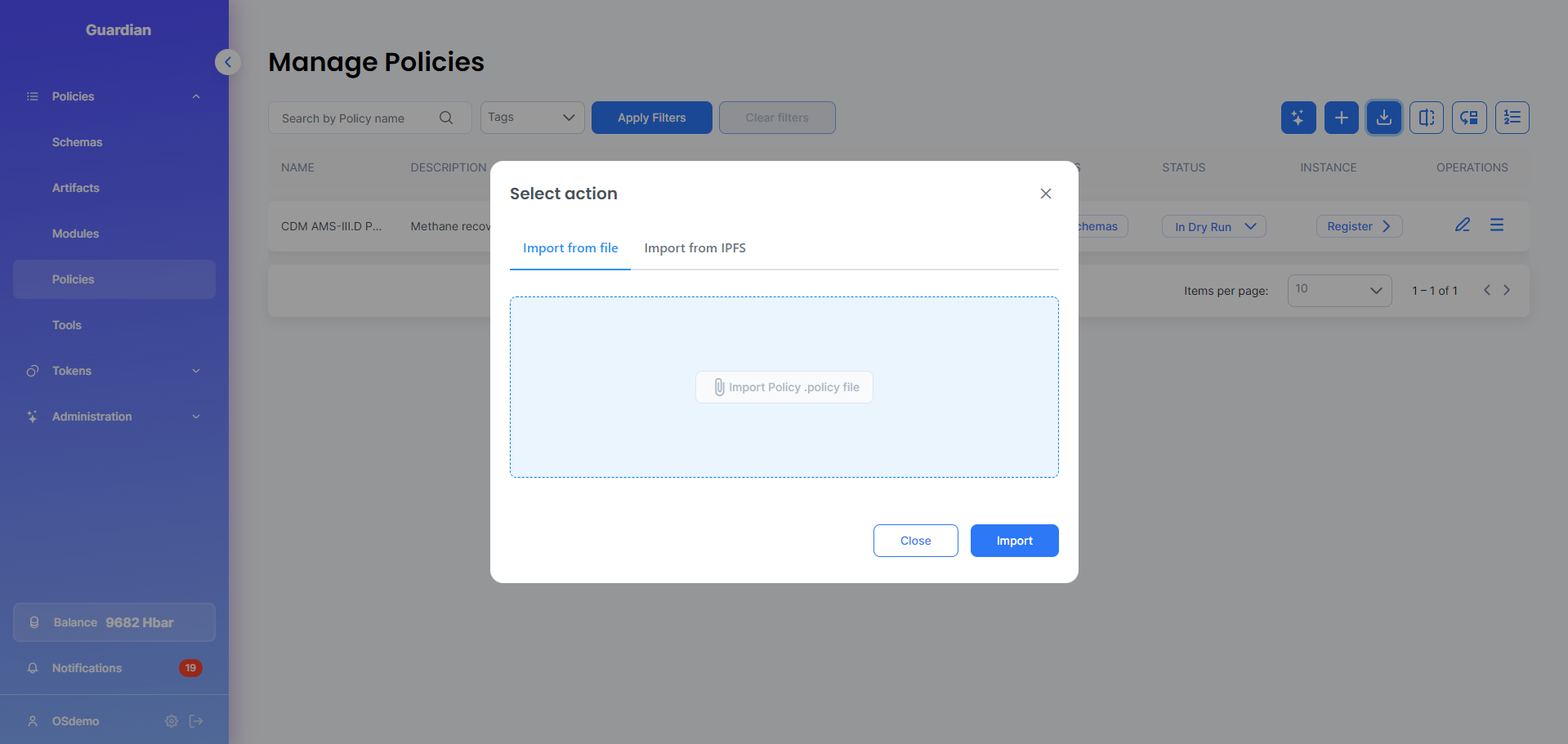 1. Log in as the Standard Registry and import the policy either by file or through IPFS timestamp by selecting the third button at the top right