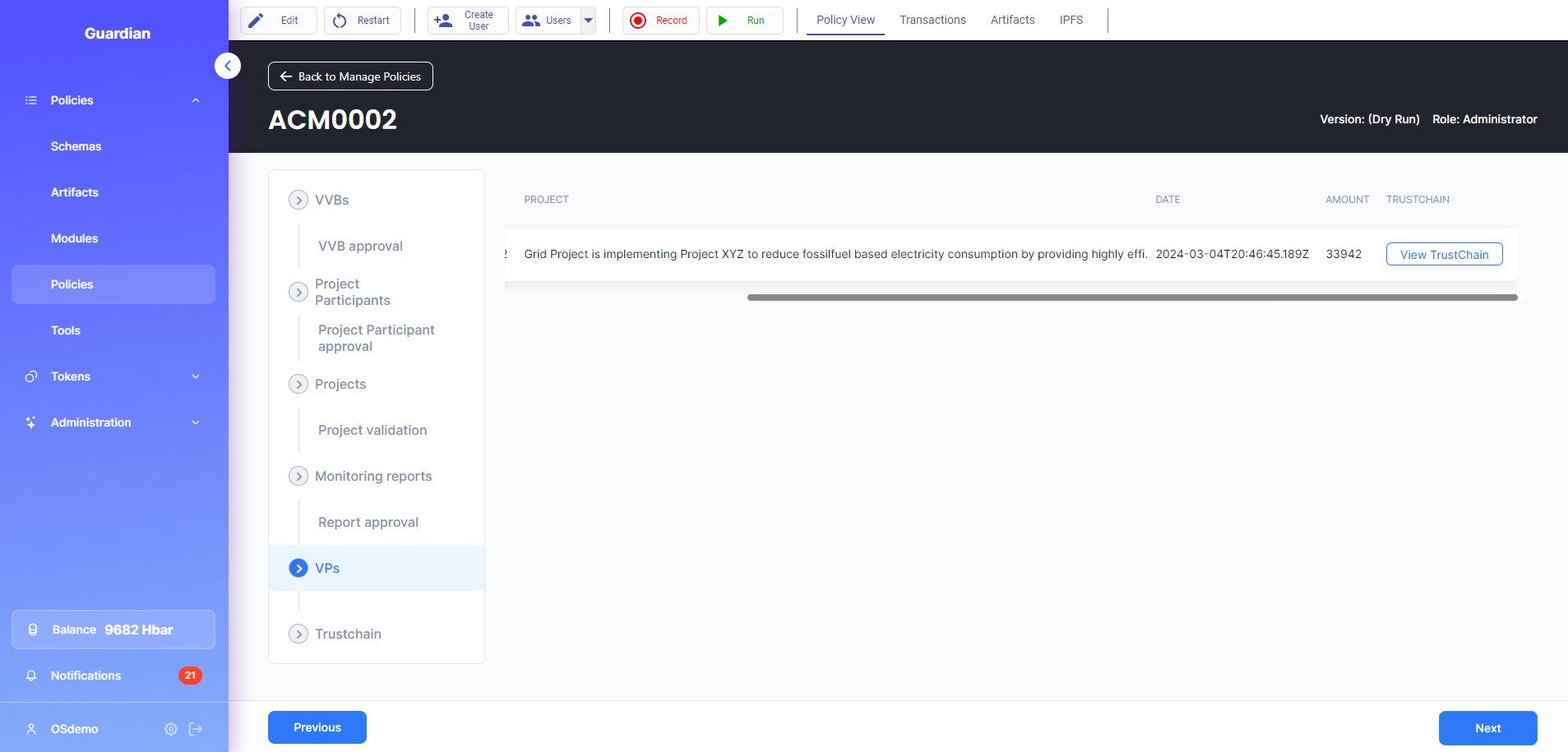 13. Log in as the SR to review the monitoring report by selecting the “View Document” button in the “Monitoring Reports” tab. The SR can approve the monitoring report by selecting “Approve”. This will also trigger the minting process. You can see the minting status under “Status” change from “Minting” to “Minted”.