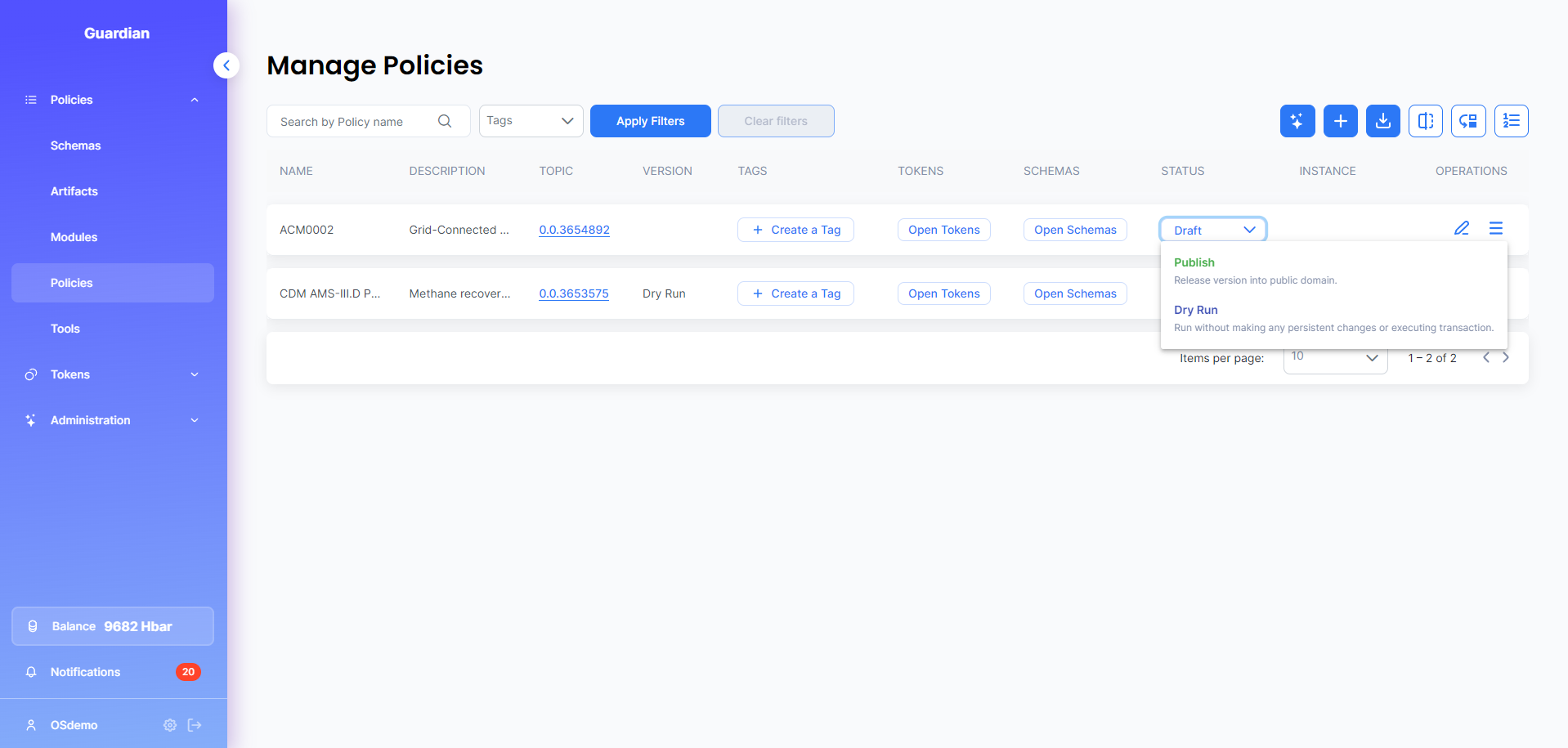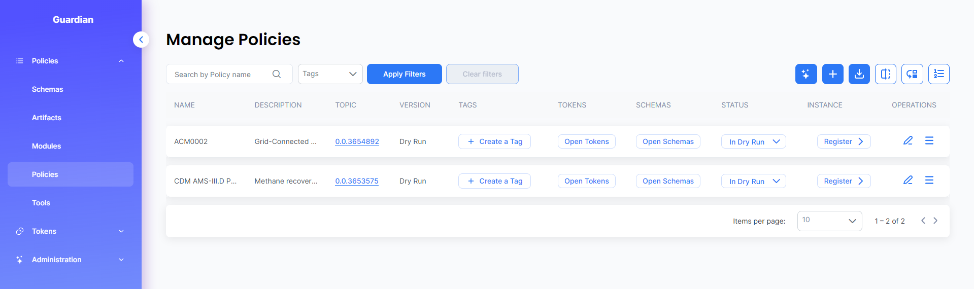 2. To start using the policy you first have to change the status of the policy from “Draft” to “Dry Run” or “Publish”, then select the “Register” button.