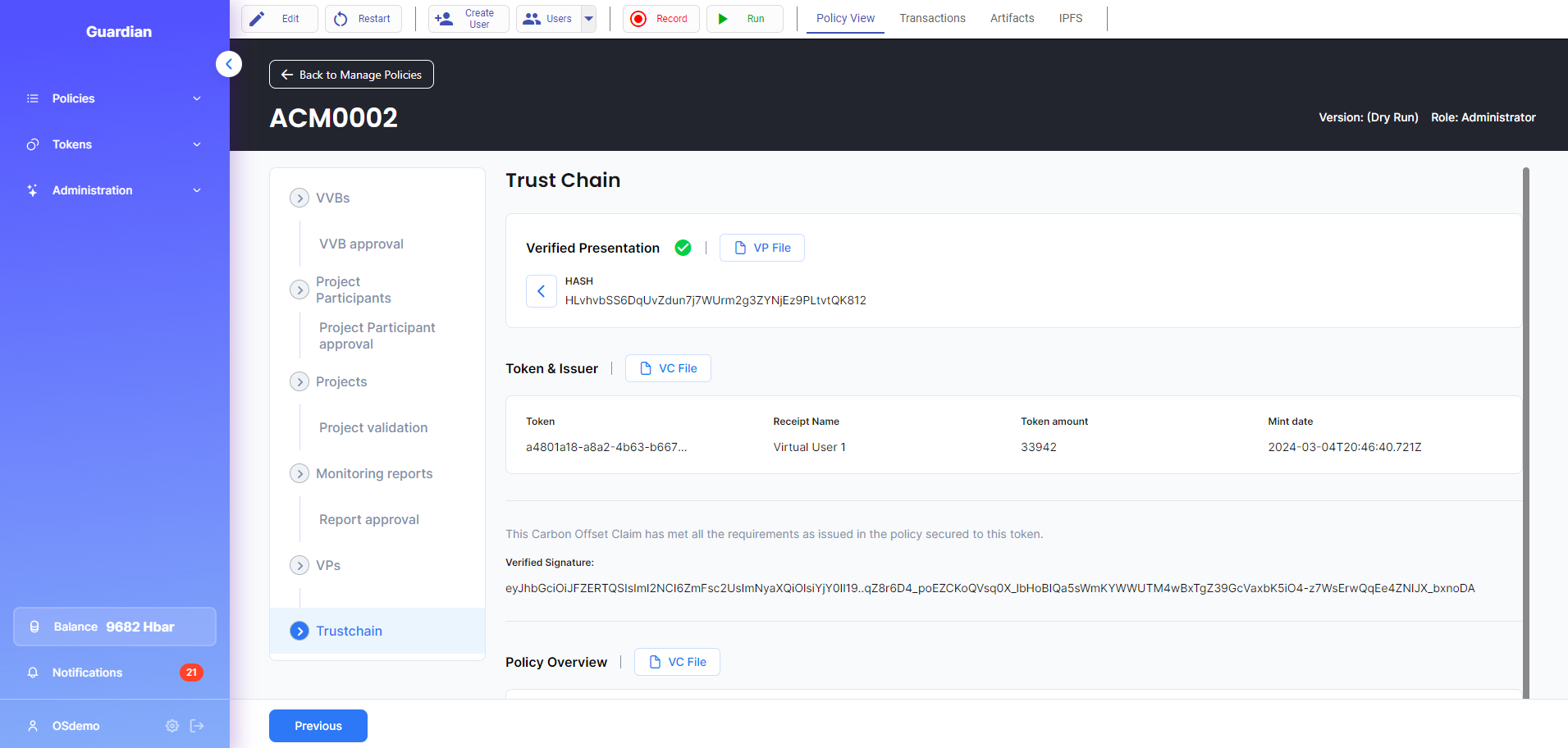 15. The TrustChain can also be viewed by clicking on the “View TrustChain” button. Please note that the token amount may show “-1” when the tokens are still minting. Once the process is complete a notification will appear stating that the tokens have been minted and transferred.