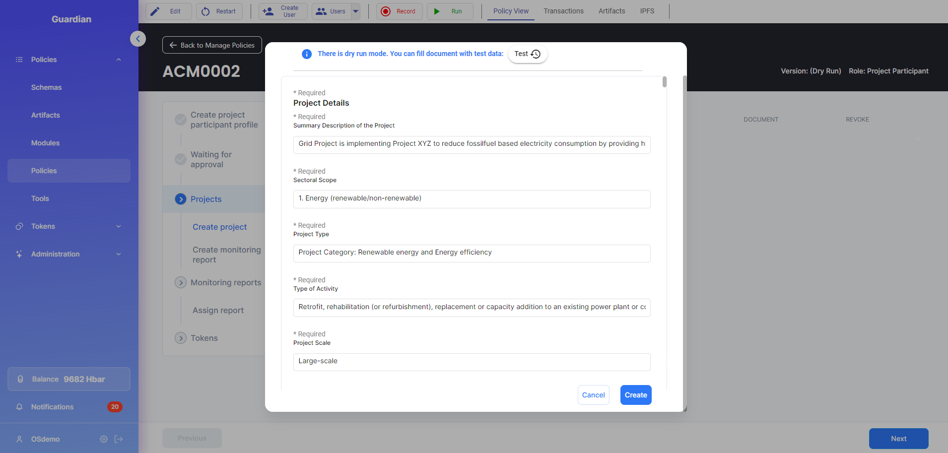 8. Log in as the Project Participant and create a new project by clicking on the "New Project" button. This form is used to collect information about the project, organization, and all the data needed to run the emission reduction calculations. Once all the required fields have been filled the “Create” button will turn dark blue. By selecting the “Create” button all the data will be sent to the SR for review/approval.