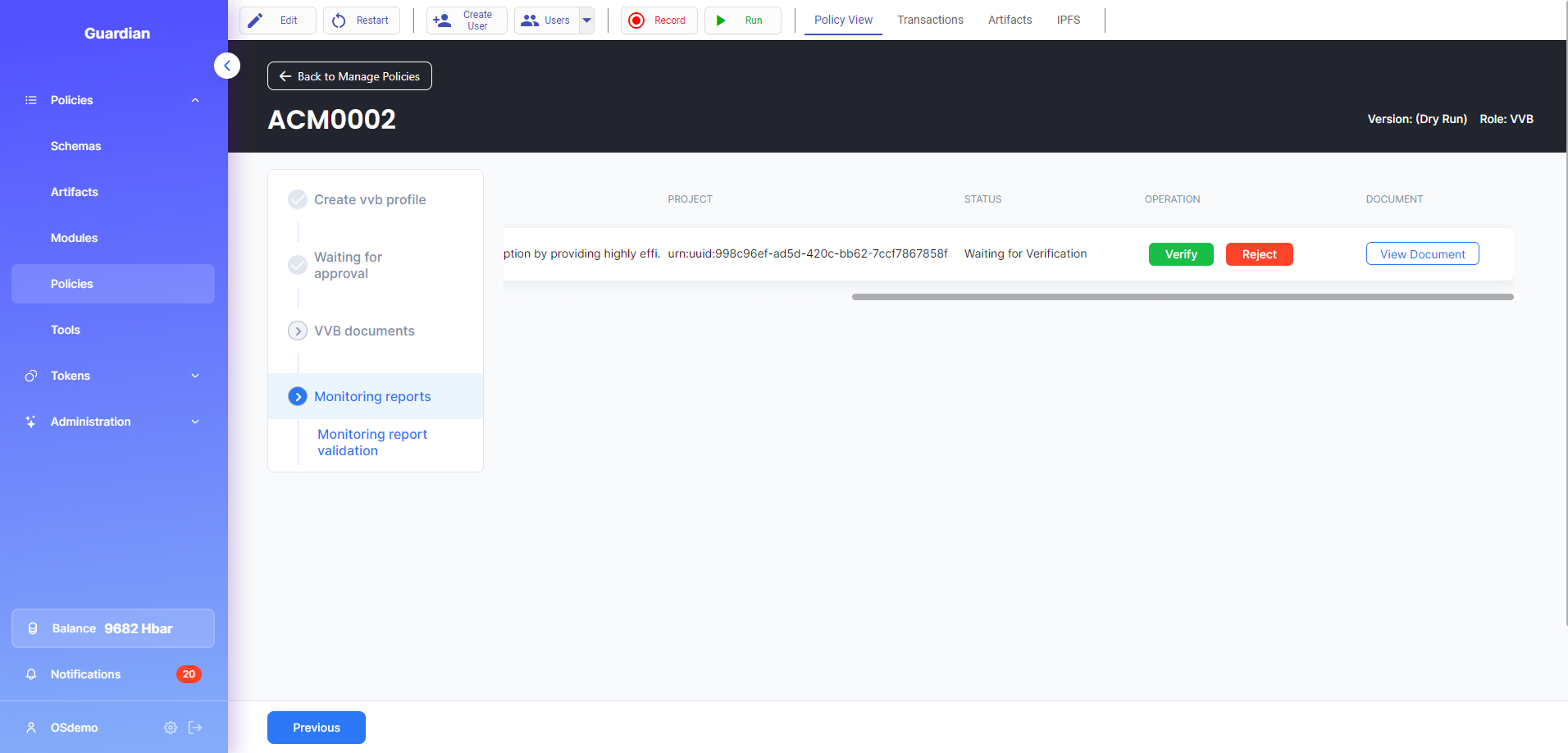 12. Log in as the VVB and click the “Monitoring Reports” tab to review the document submitted by the Project Participant. After reviewing the monitoring report by selecting “View Document”, the VVB can select “Verify”.