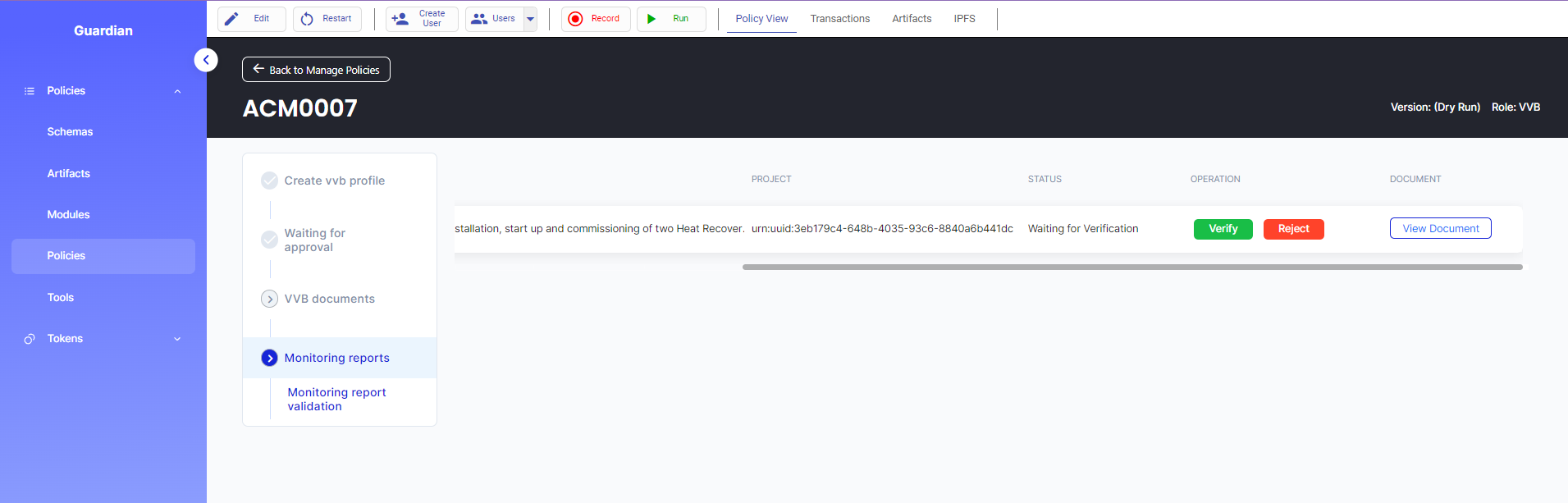 Log in as the VVB and click the “Monitoring Reports” tab to review the document submitted by the Project Participant. After reviewing the monitoring report by selecting “View Document”, the VVB can select “Verify”.