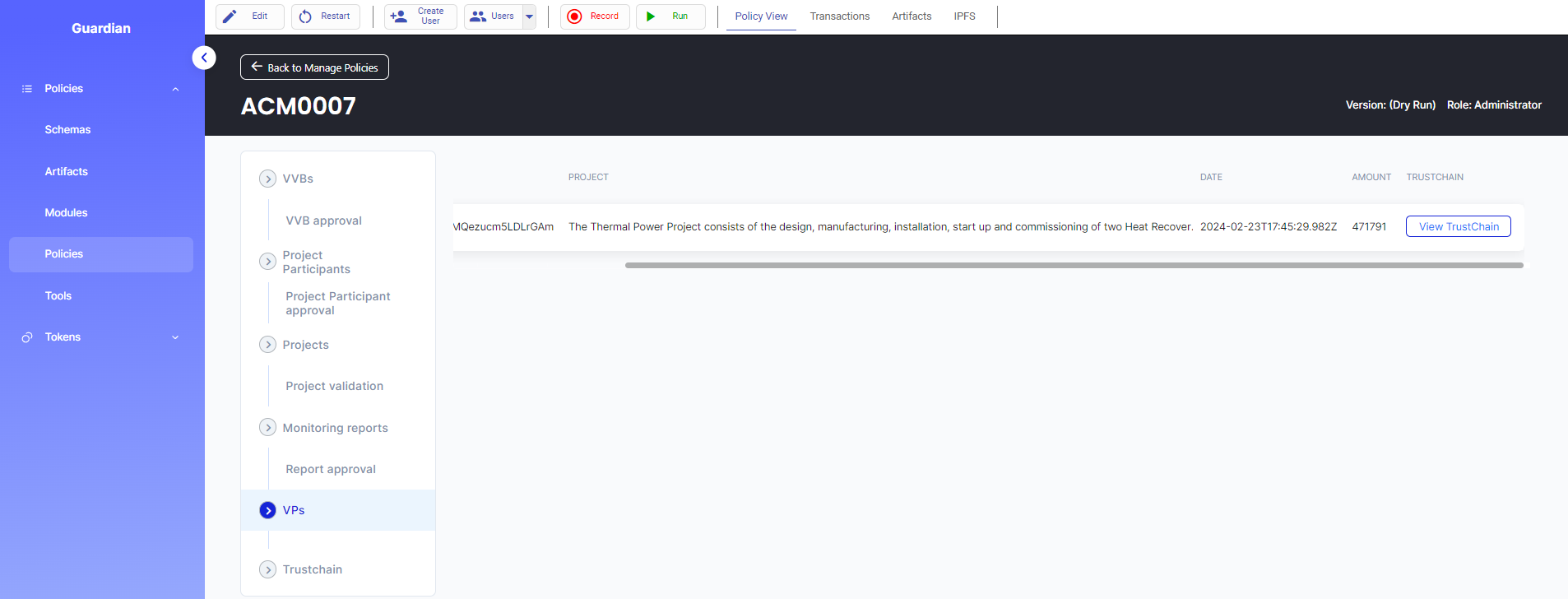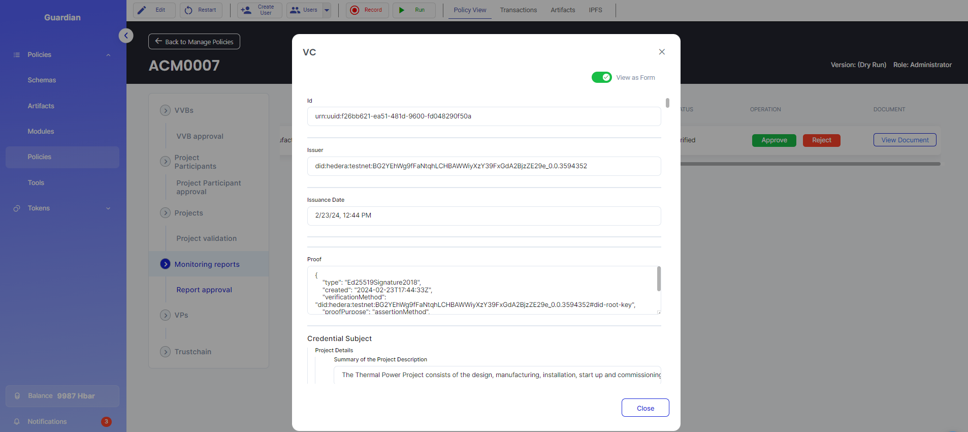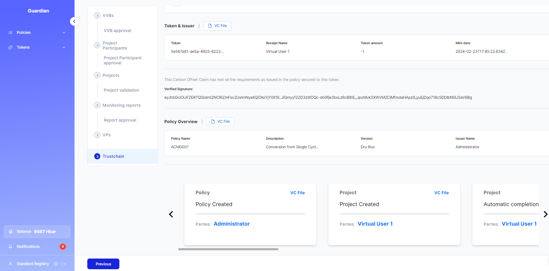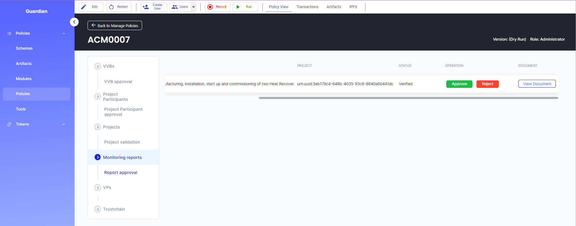 Log in as the SR to review the monitoring report by selecting the “View Document” button in the “Monitoring Reports” tab. The SR can approve the monitoring report by selecting “Approve”. This will also trigger the minting process. You can see the minting status under “Status” change from “Minting” to “Minted”.