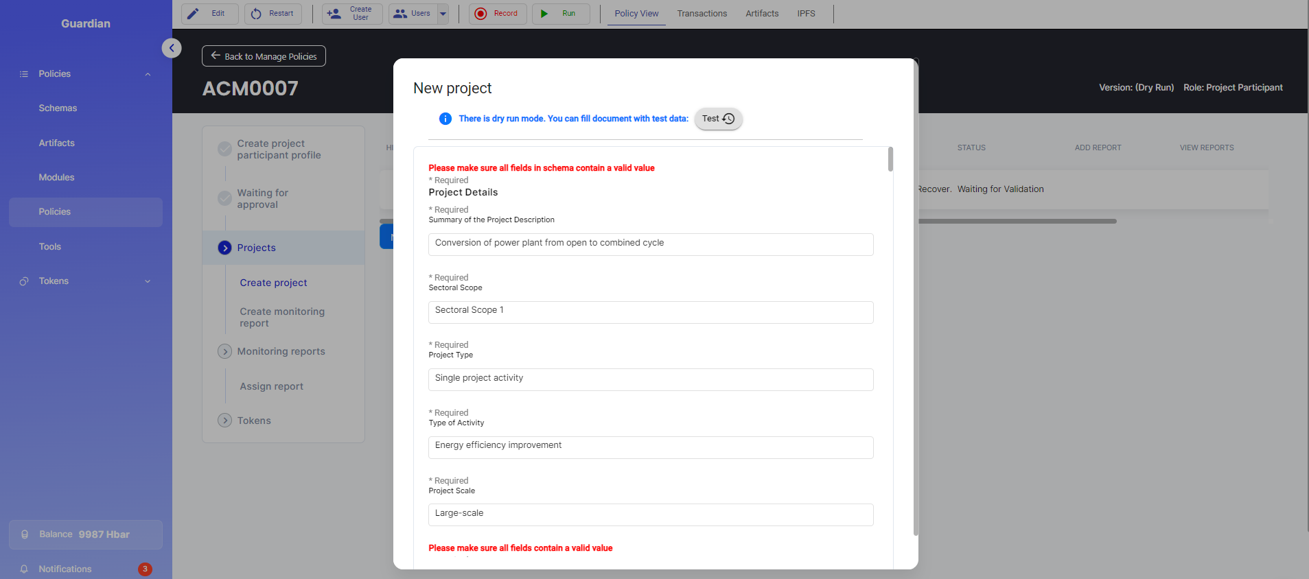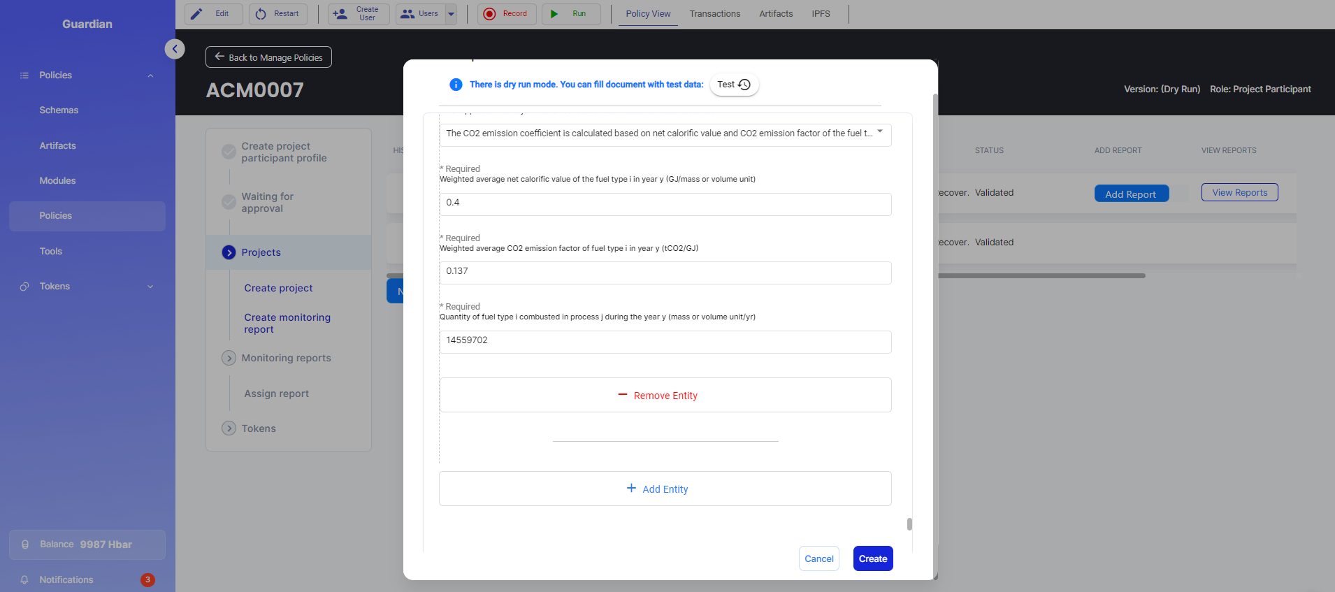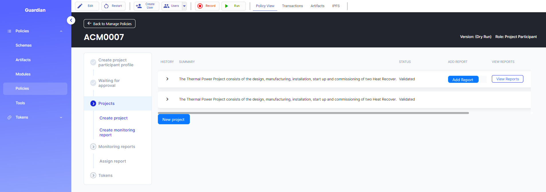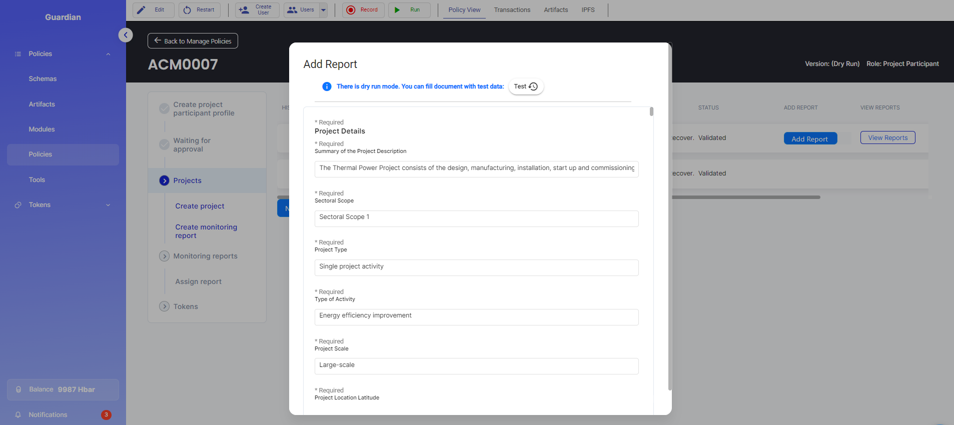 Log in as the Project Participant and create a monitoring report by clicking on the “Add Report” button then fill out the monitoring report form.