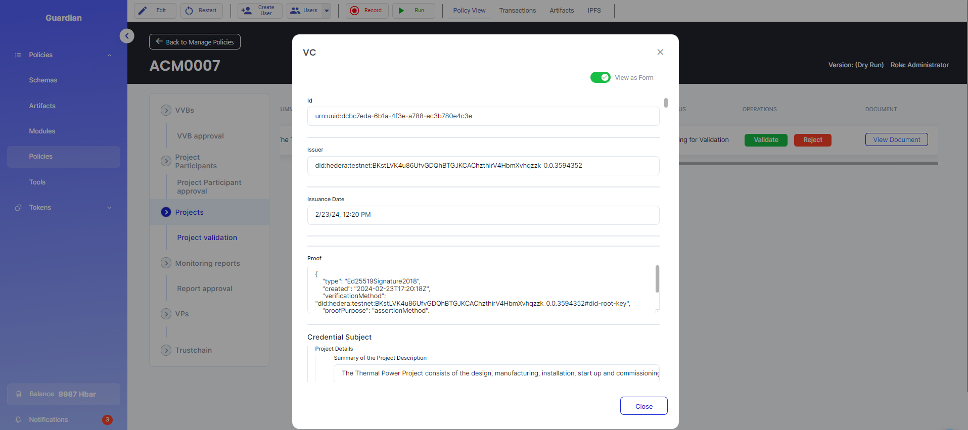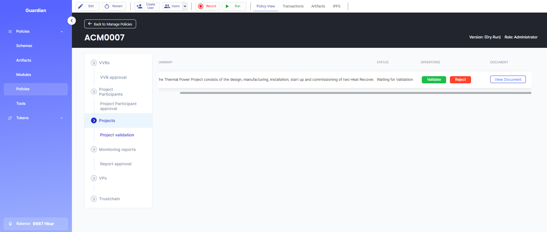 Log back in as the SR and after reviewing the document by selecting the “View Document” button, the SR can validate the project submitted by the Project Participant by clicking the “Validate” button. If the data does not satisfy the rules set by the SR, then the “Reject” button can be used.