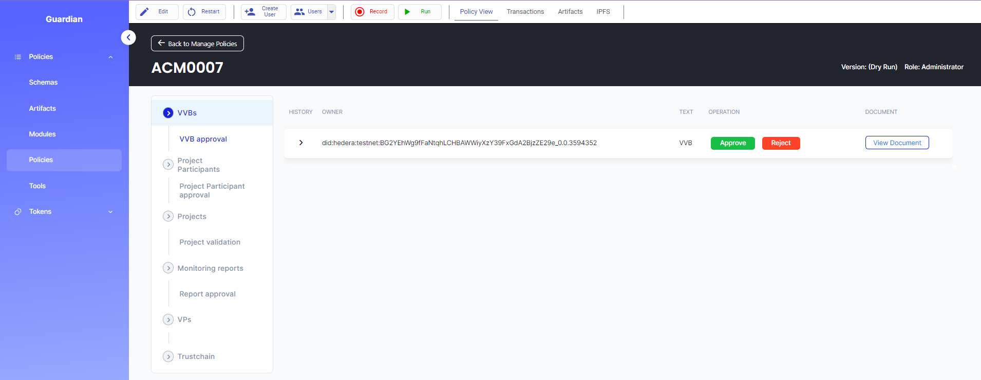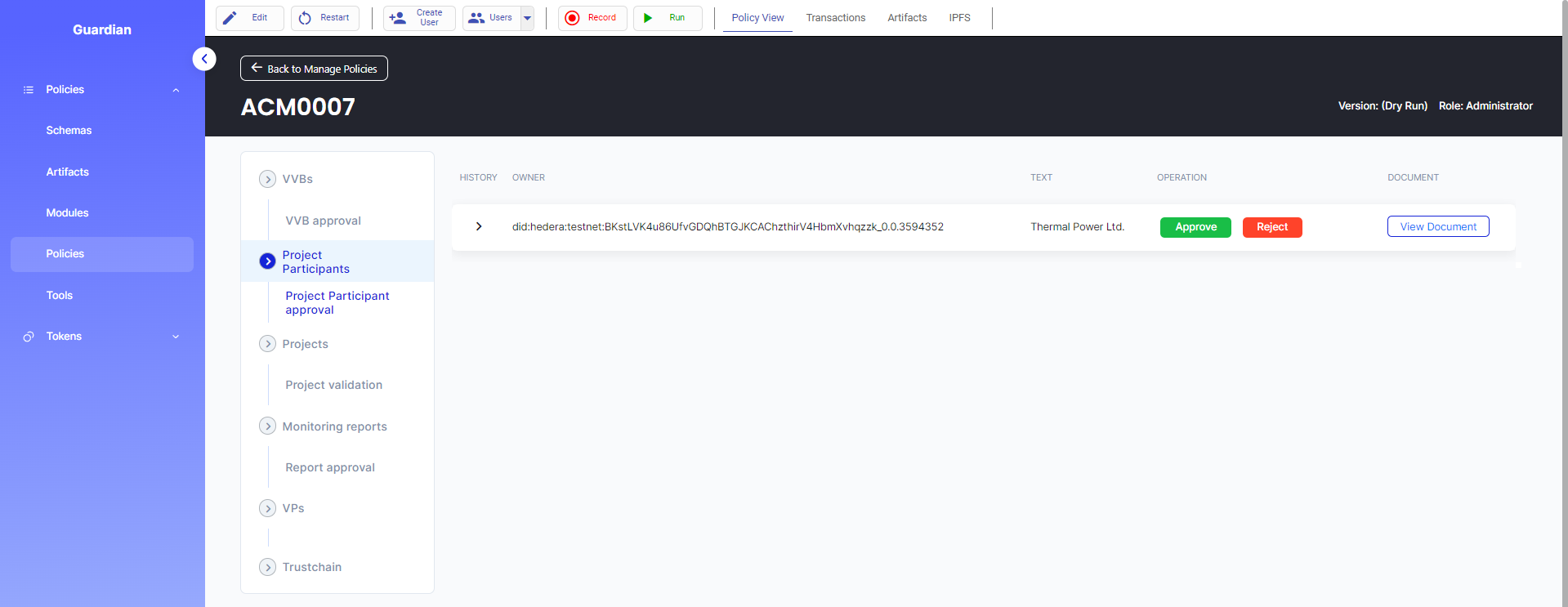 Log in as the SR and select the “Project Participants” or the “VVBs” tab to view the documents submitted by the Project Participant and by the VVB. The SR can approve their requests by clicking on the “Approve" button.