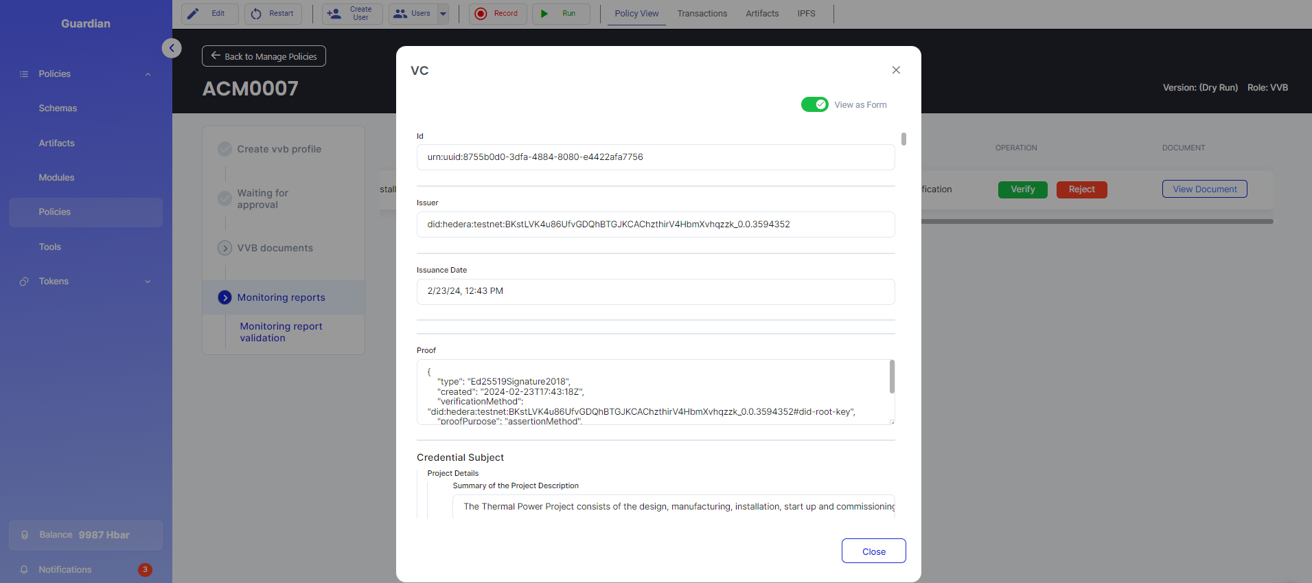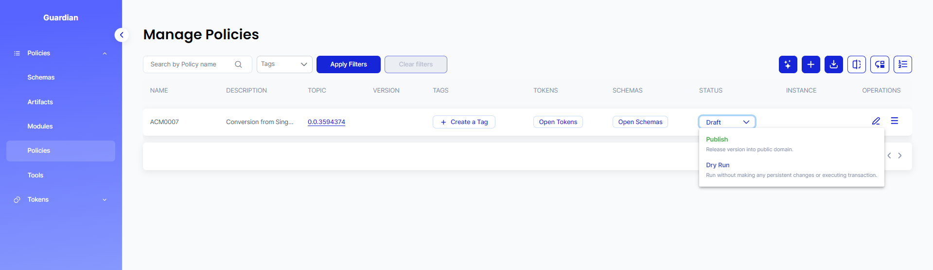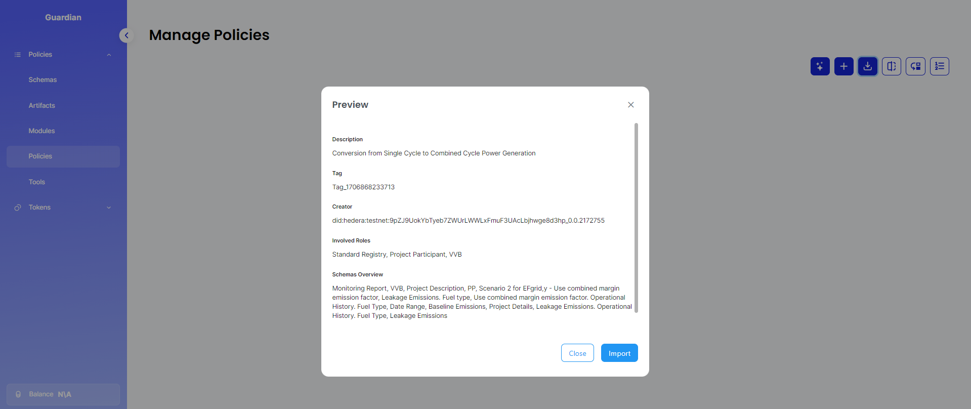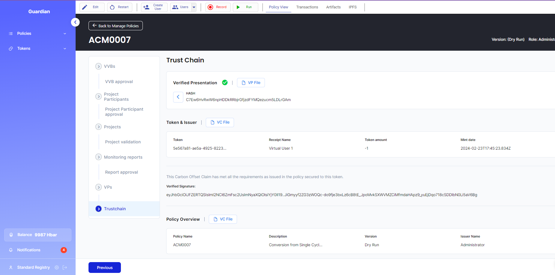 This policy is published to Hedera network and can either be imported via Github (.policy file) or IPFS timestamp
