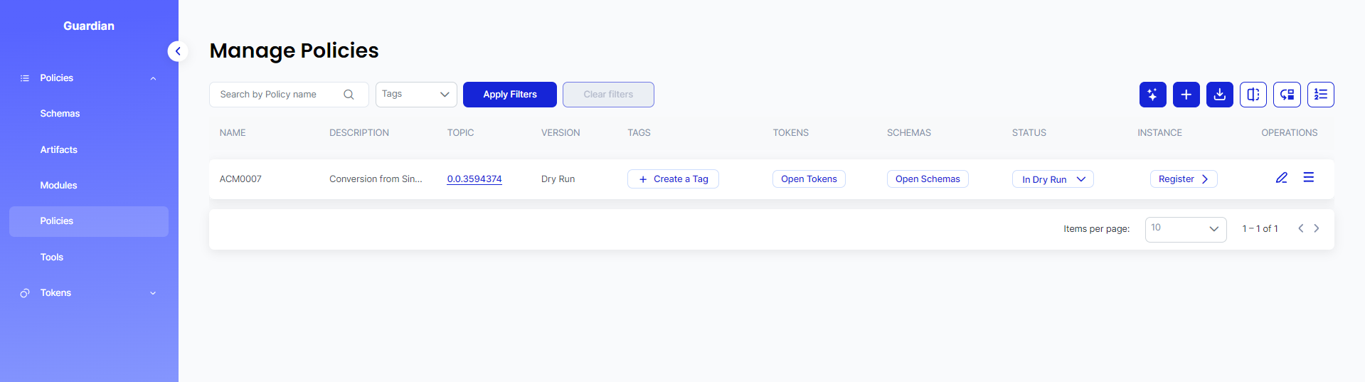 To start using the policy you first have to change the status of the policy from “Draft” to “Dry Run” or “Publish”, then select the “Register” button.