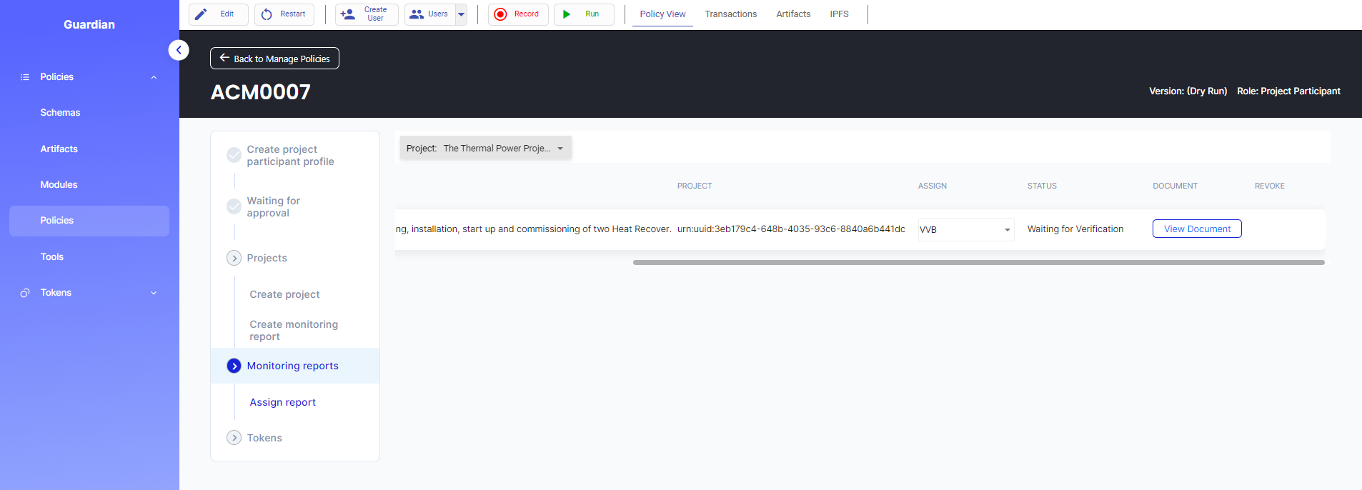 After creating the monitoring report, the project participant assigns the VVB to verify it by navigating to the “Monitoring Reports” tab and selecting the dropdown under “Assign”.