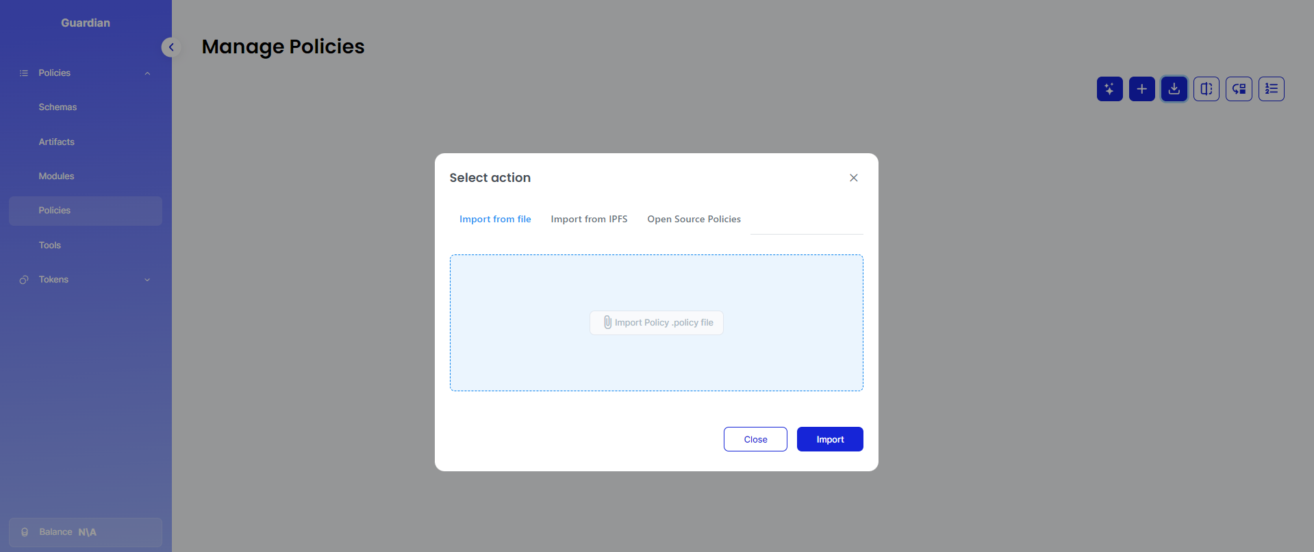 Log in as the Standard Registry and import the policy either by file or through IPFS timestamp by selecting the third button at the top right.