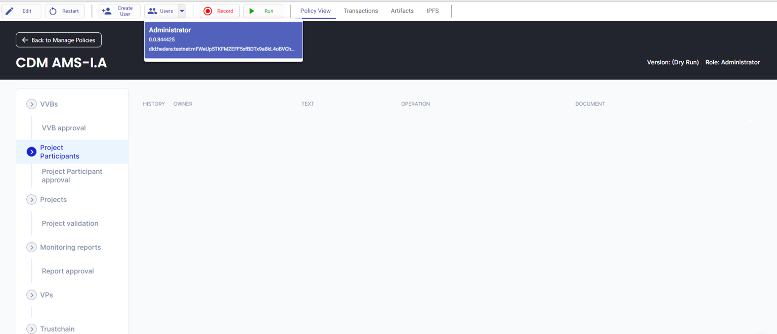 7. Log in as the SR and select the “Project Participants” or the “VVBs” tab to view the documents submitted by the Project Participant and by the VVB. The SR can approve their requests by clicking on the “Approve" button.