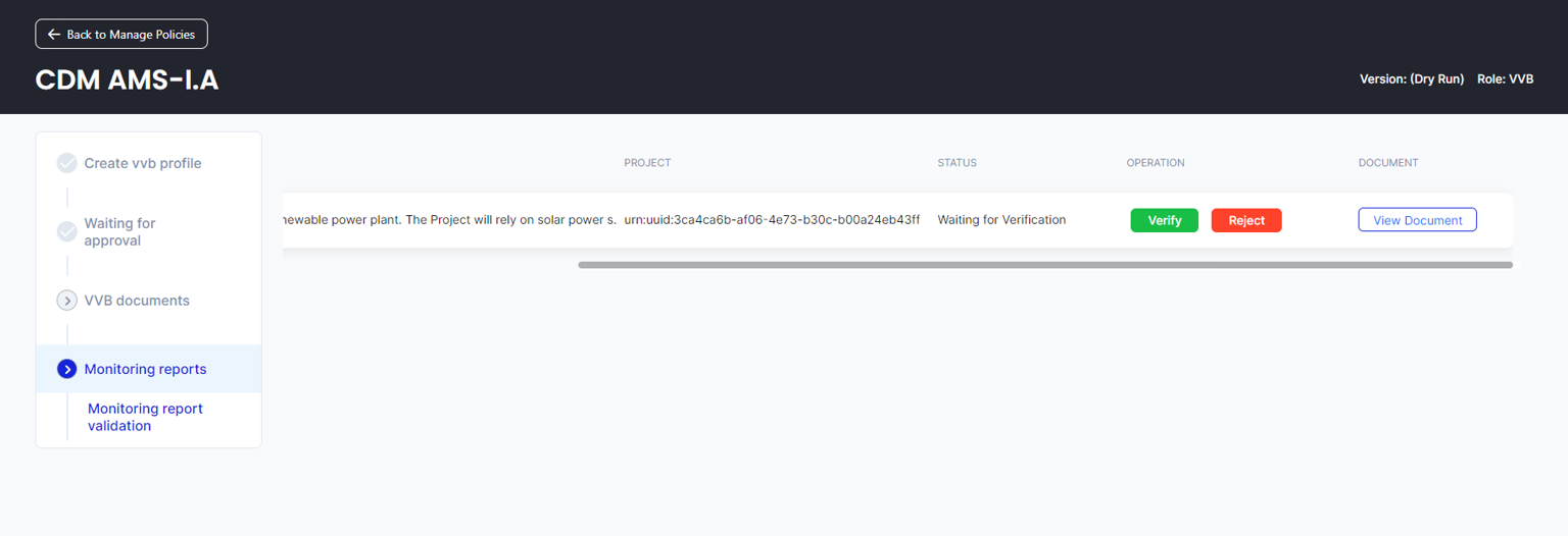 12. Log in as the VVB and click the “Monitoring Reports” tab to review the document submitted by the Project Participant. After reviewing the monitoring report by selecting “View Document”, the VVB can select “Verify”.
