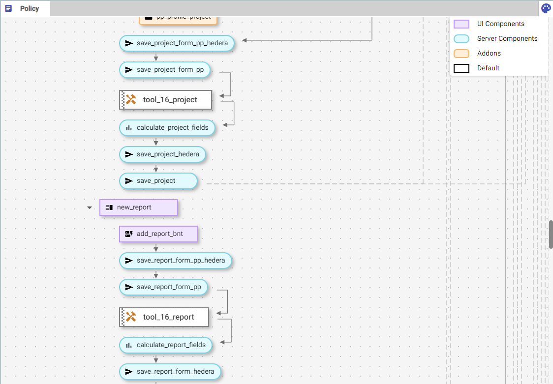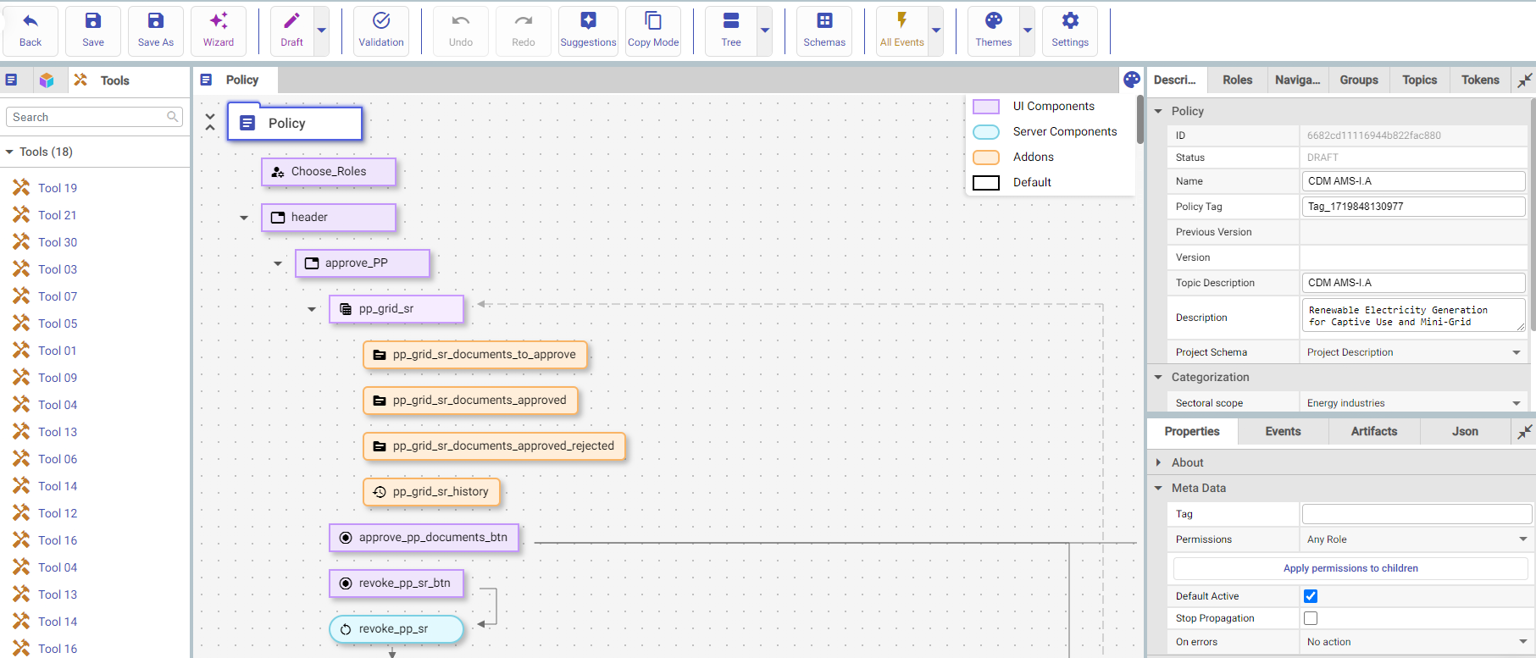 2. Once the policy has successfully imported, you will be redirected to the policy configurator. The policy configurator can be used to edit the policy using the workflow blocks. There will also be a tab for the “Tools” used within this policy as illustrated in the image below. To start using the policy you must first change the status of the policy from “Draft” to “Dry Run” or “Publish”, then select the “Register” or “Go” button. This can be done through the policy configurator page or though the “Policies” page.