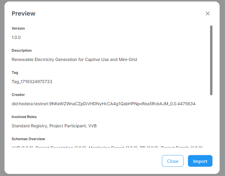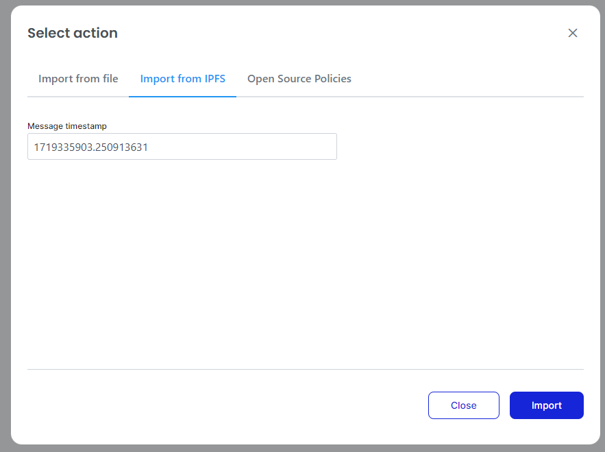 1. Log in as the Standard Registry and import the policy either by file or through IPFS timestamp by selecting the third button at the top right.
