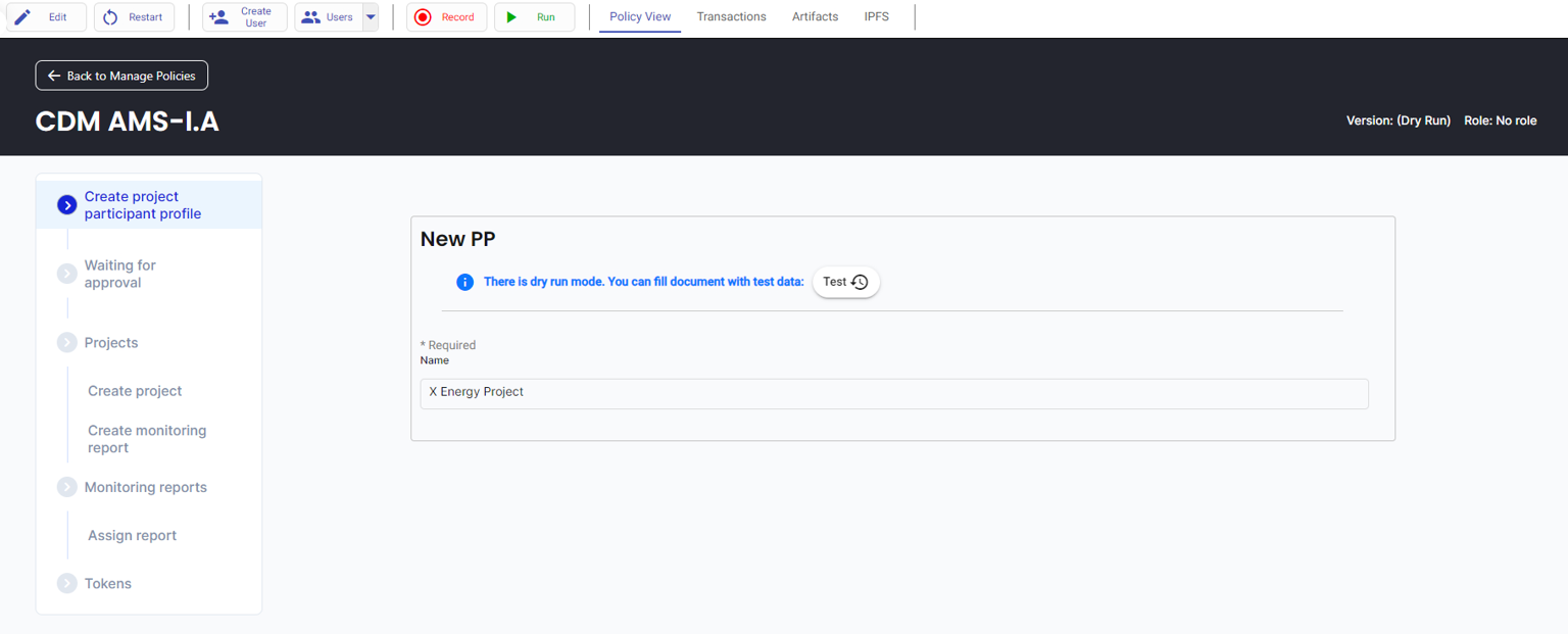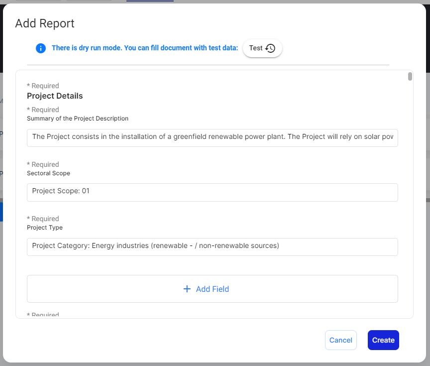 10. Log in as the Project Participant and create a monitoring report by clicking on the “Add Report” button then fill out the monitoring report form.