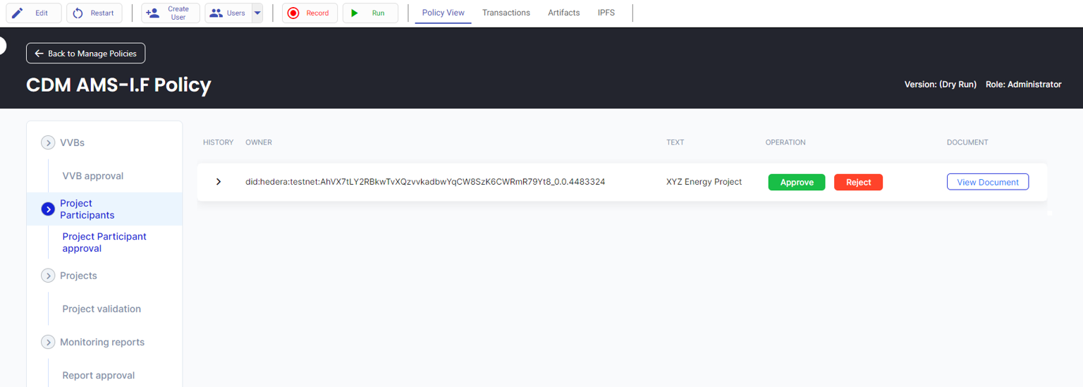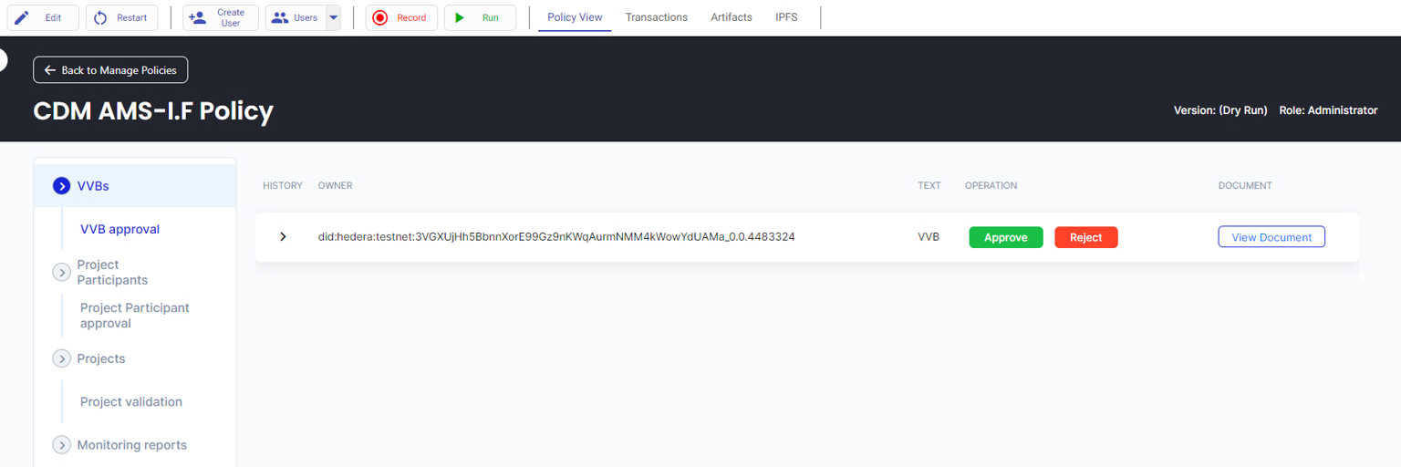 7. Log in as the SR and select the “Project Participants” or the “VVBs” tab to view the documents submitted by the Project Participant and by the VVB. The SR can approve their requests by clicking on the “Approve" button.