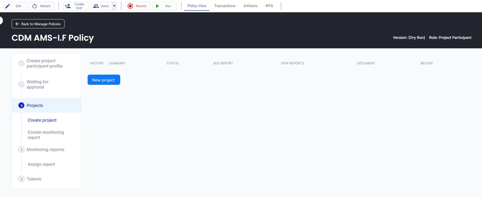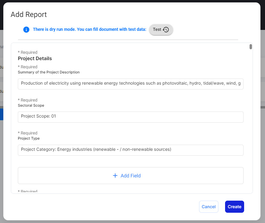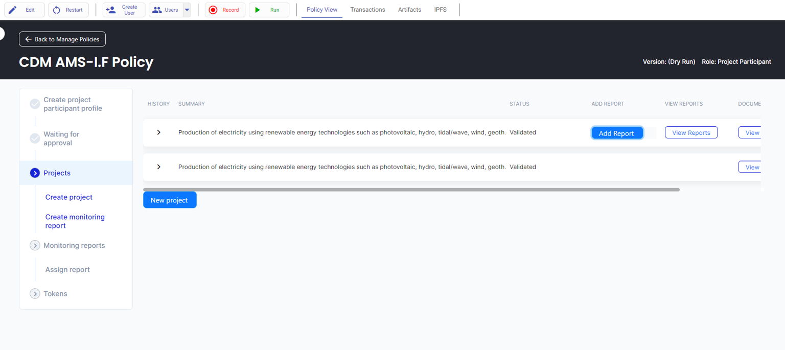 10. Log in as the Project Participant and create a monitoring report by clicking on the “Add Report” button then fill out the monitoring report form.