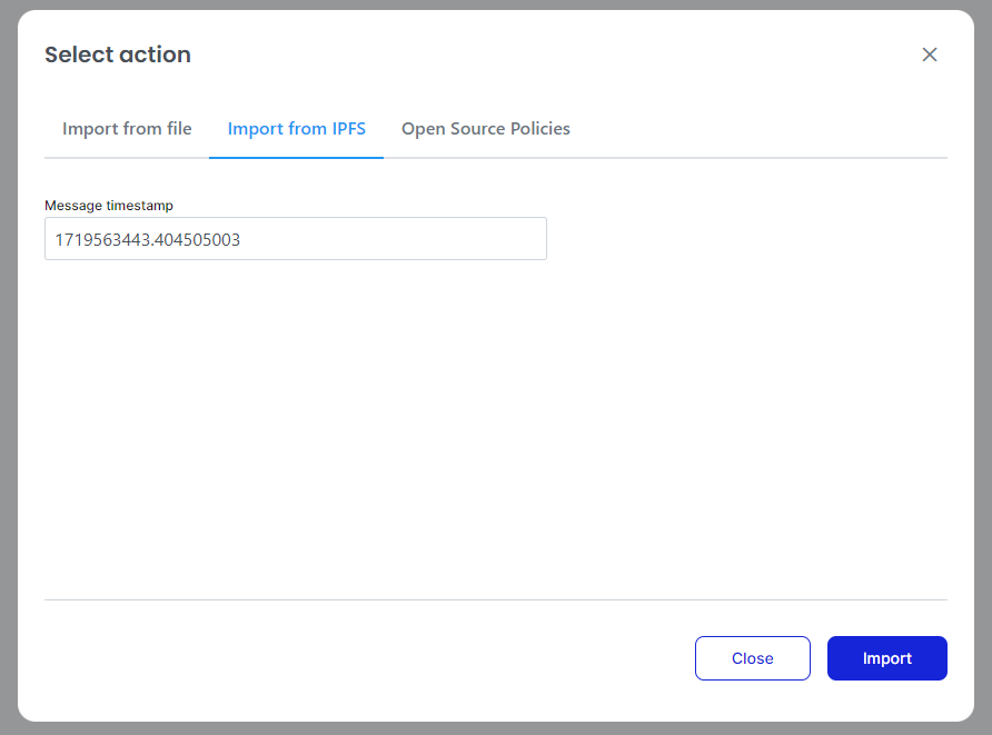 1. Log in as the Standard Registry and import the policy either by file or through IPFS timestamp by selecting the third button at the top right.