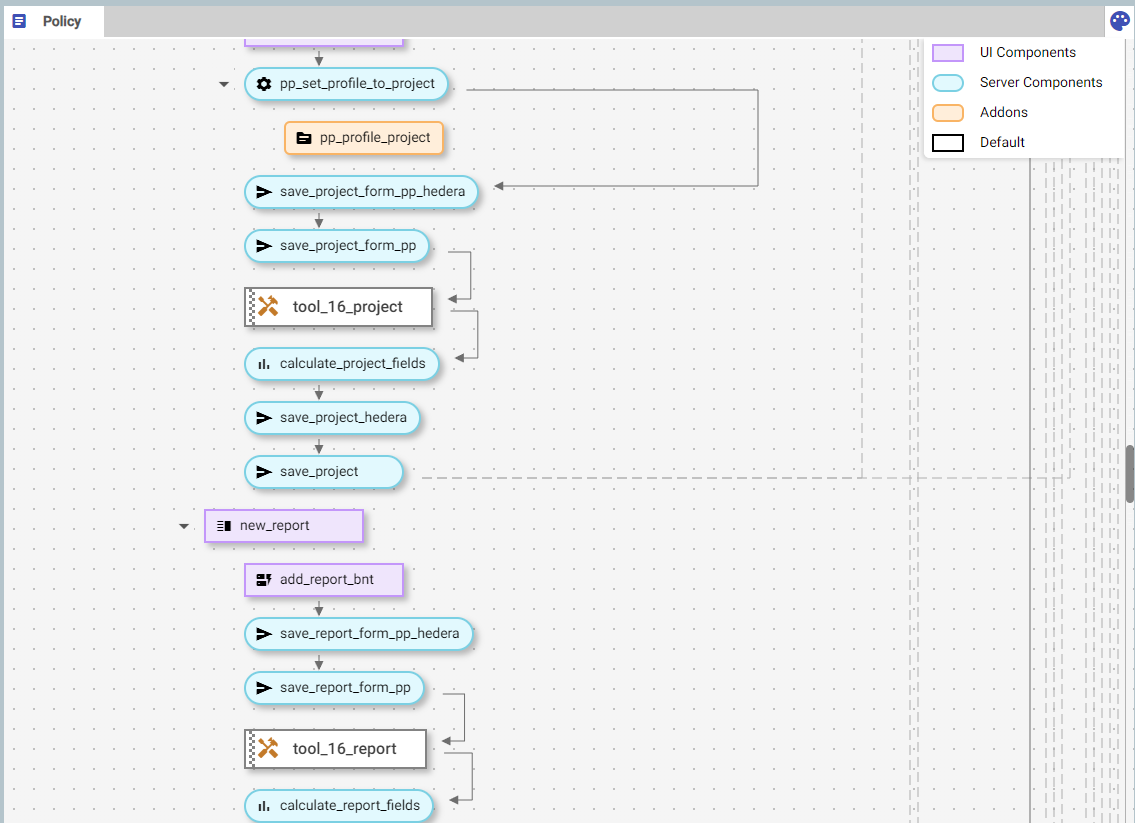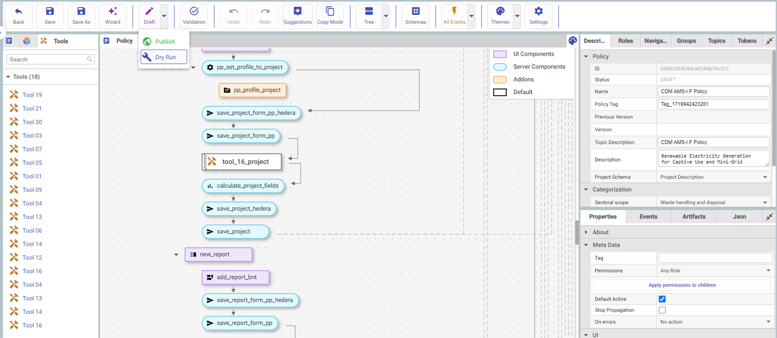 2. Once the policy has successfully imported, you will be redirected to the policy configurator. The policy configurator can be used to edit the policy using the workflow blocks. There will also be a tab for the “Tools” used within this policy as illustrated in the image below. To start using the policy you must first change the status of the policy from “Draft” to “Dry Run” or “Publish”, then select the “Register” or “Go” button. This can be done through the policy configurator page or though the “Policies” page.