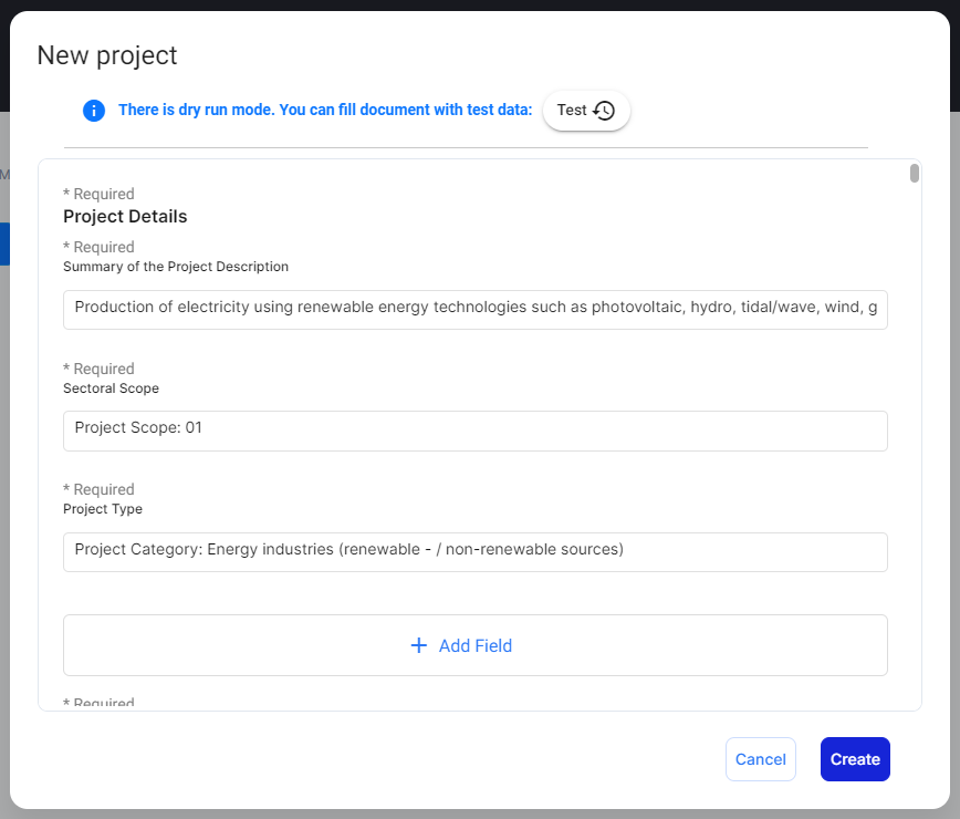 8. Log in as the Project Participant and create a new project by clicking on the "New Project" button. This form is used to collect information about the project, organization, and all the data needed to run the emission reduction calculations. Once all the required fields have been filled the “Create” button will turn dark blue. By selecting the “Create” button all the data will be sent to the SR for review/approval.