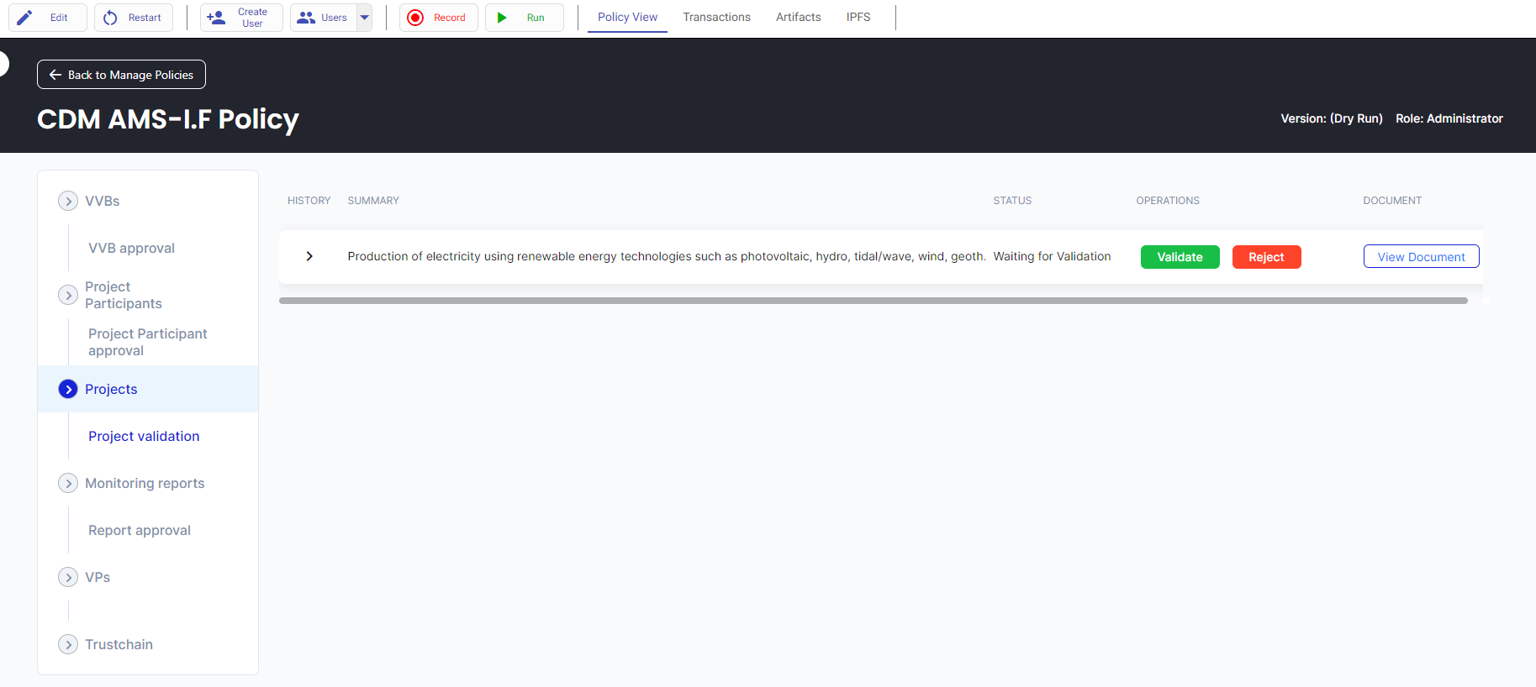 9. Log back in as the SR and after reviewing the document located in the “Projects” tab, the SR can validate the project submitted by the Project Participant by clicking the “Validate” button. If the data does not satisfy the rules set by the SR, then the “Reject” button can be used.