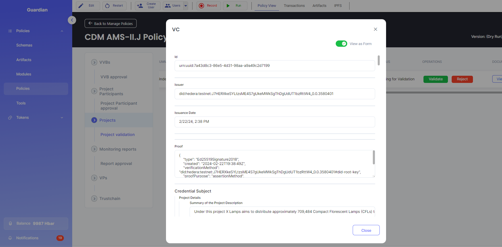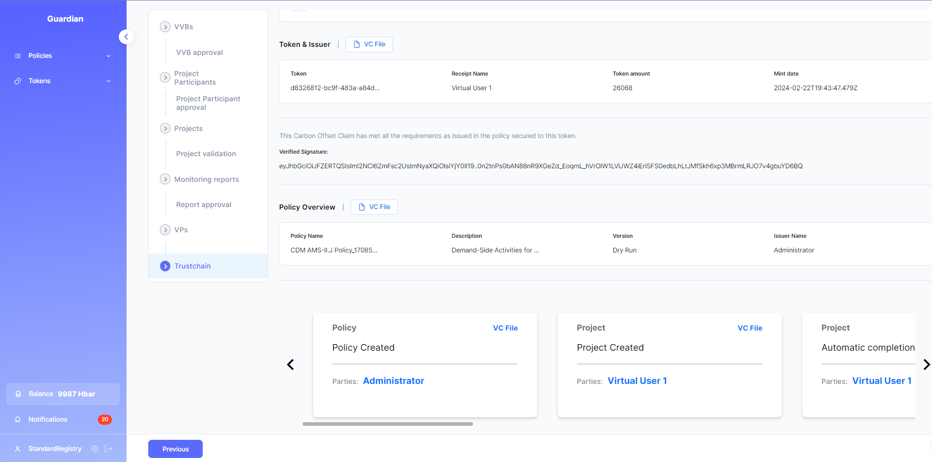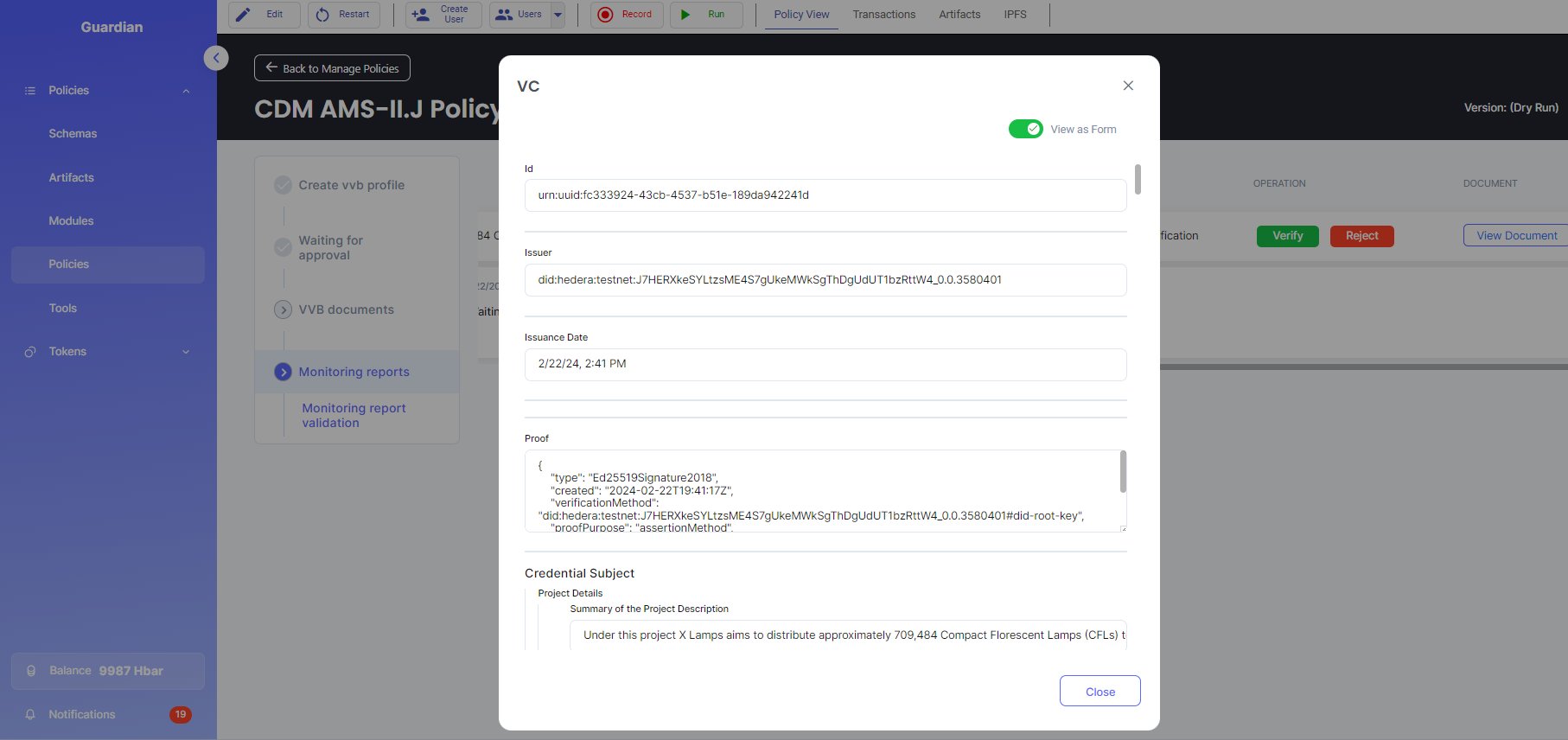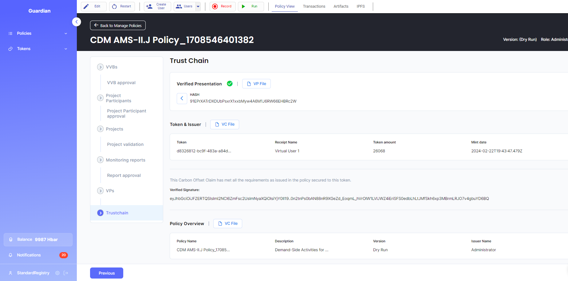 This policy is published to Hedera network and can either be imported via Github (.policy file) or IPFS timestamp.