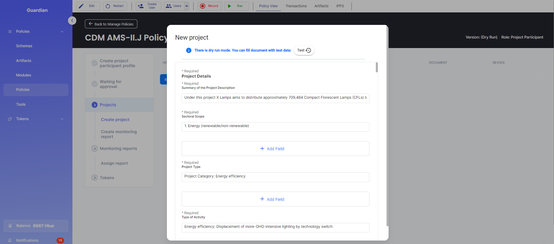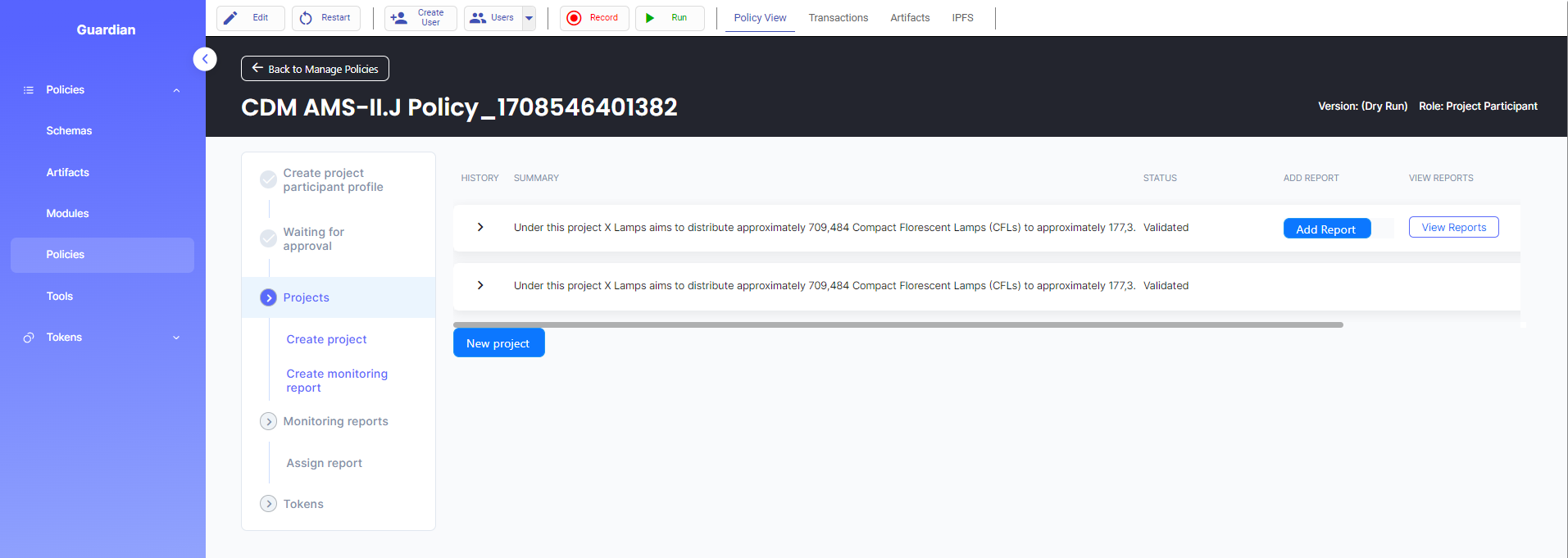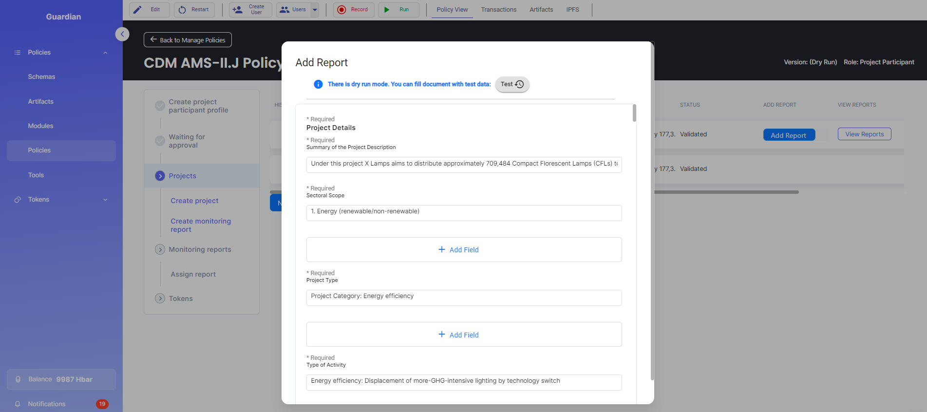 10. Log in as the Project Participant and create a monitoring report by clicking on the “Add Report” button then fill out the monitoring report form.