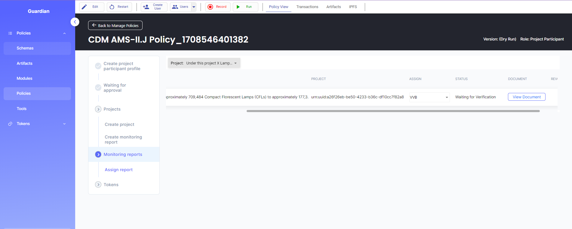 11. After creating the monitoring report, the project participant assigns the VVB to verify it by navigating to the “Monitoring Reports” tab and selecting the dropdown under “Assign”.