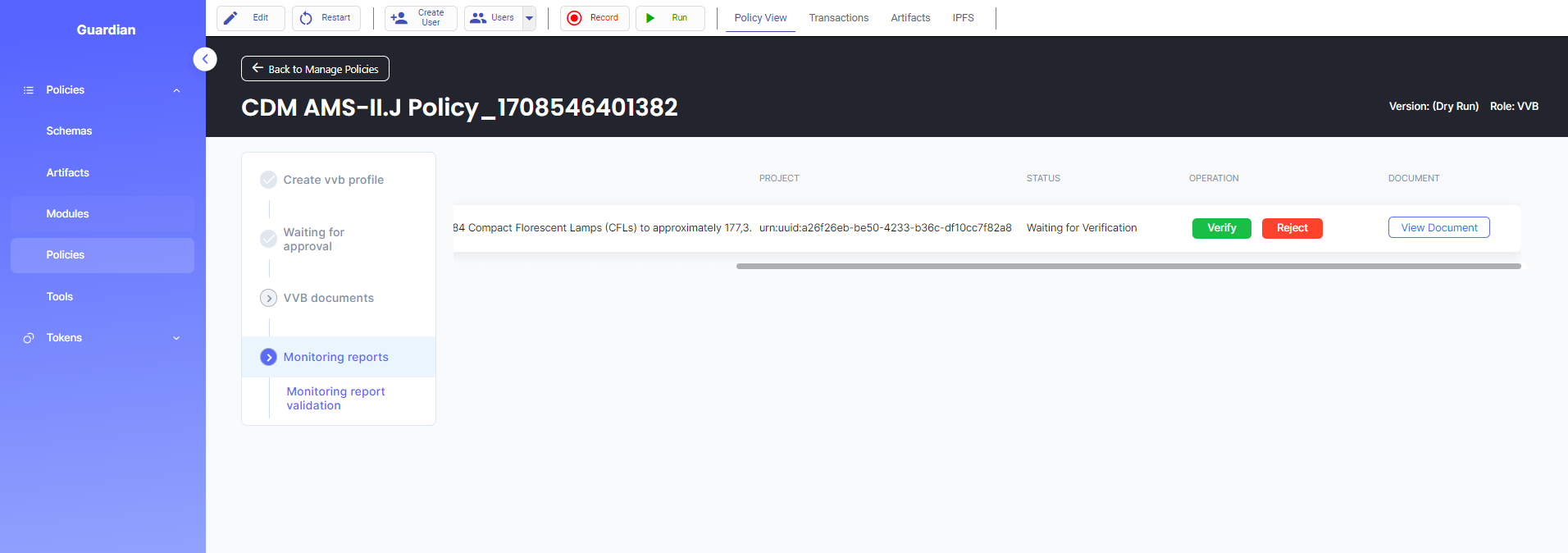 12. Log in as the VVB and click the “Monitoring Reports” tab to review the document submitted by the Project Participant. After reviewing the monitoring report by selecting “View Document”, the VVB can select “Verify”.