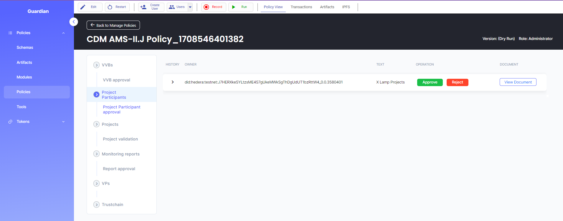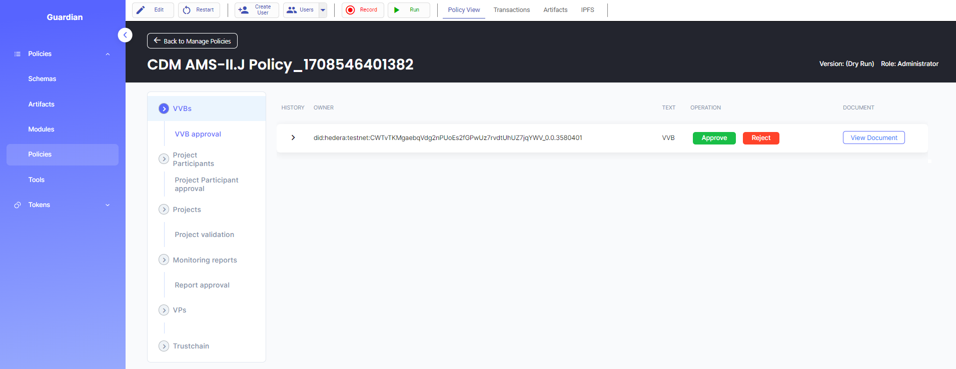 7. Log in as the SR and select the “Project Participant” or the “VVB” tab to view the documents submitted by the Project Participant and by the VVB. The SR can approve their requests by clicking on the “Approve" button.