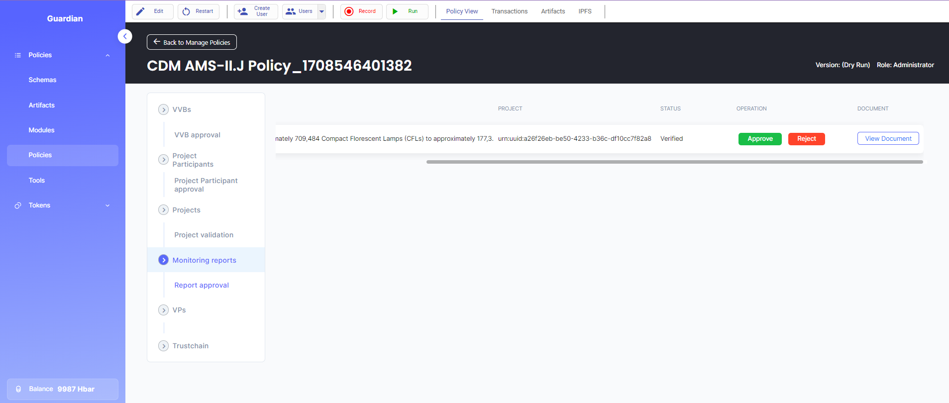 13. Log in as the SR to review the monitoring report by selecting the “View Document” button in the “Monitoring Reports” tab. The SR can approve the monitoring report by selecting “Approve”. This will also trigger the minting process. You can see the minting status under “Status” change from “Minting” to “Minted”.