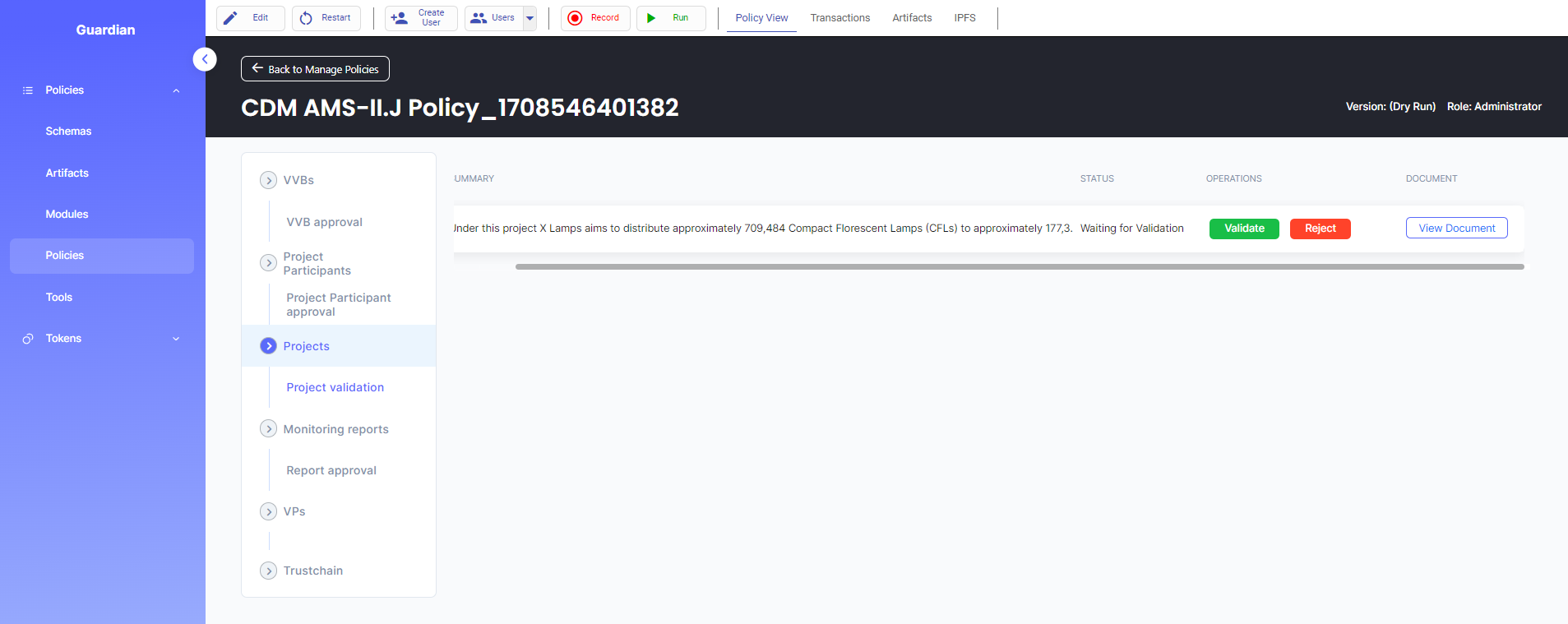 9. Log back in as the SR and after reviewing the document by selecting the “View Document” button, the SR can validate the project submitted by the Project Participant by clicking the “Validate” button. If the data does not satisfy the rules set by the SR, then the “Reject” button can be used.