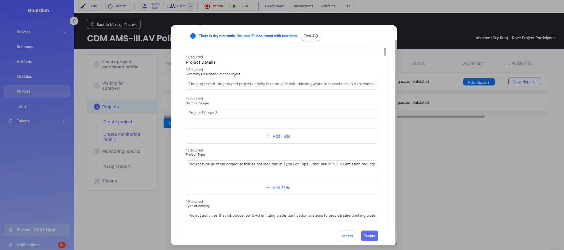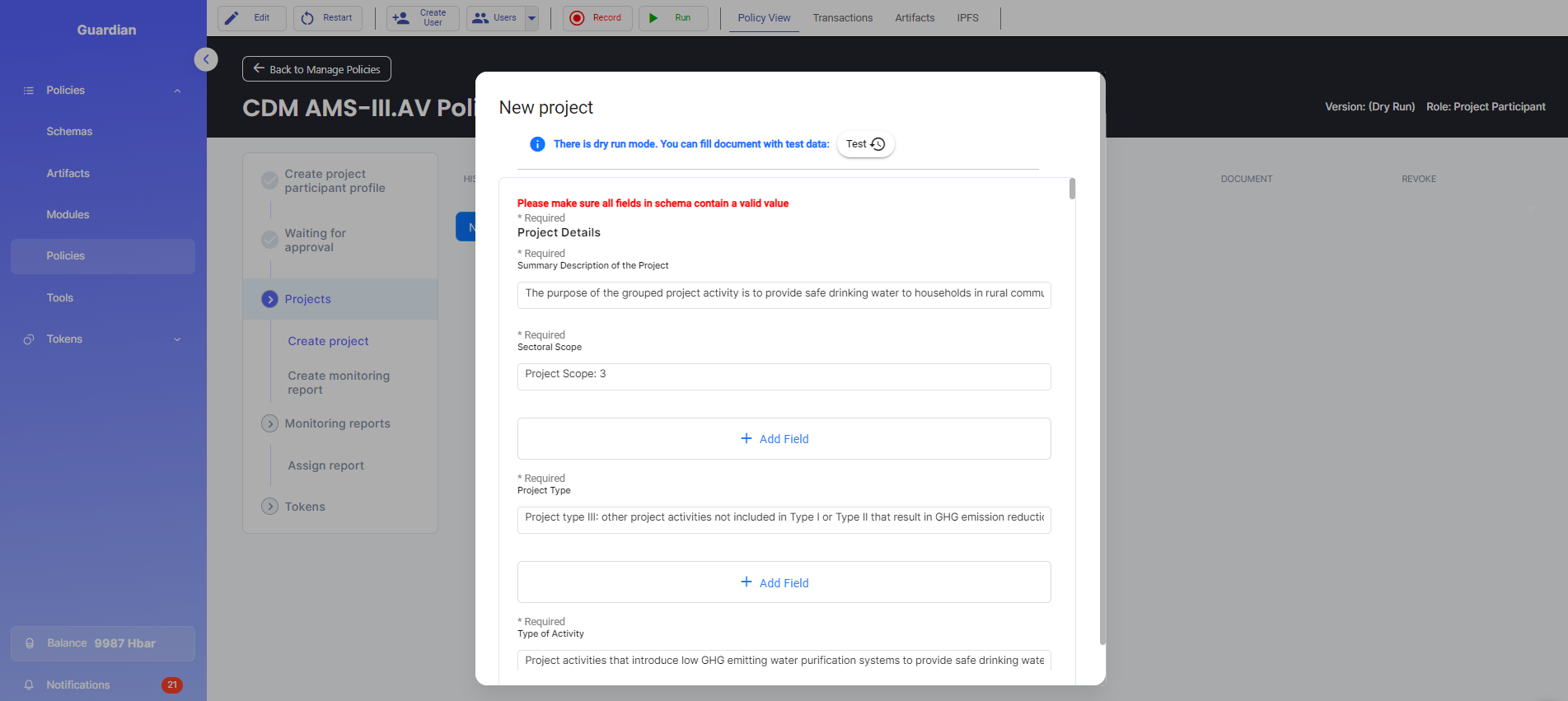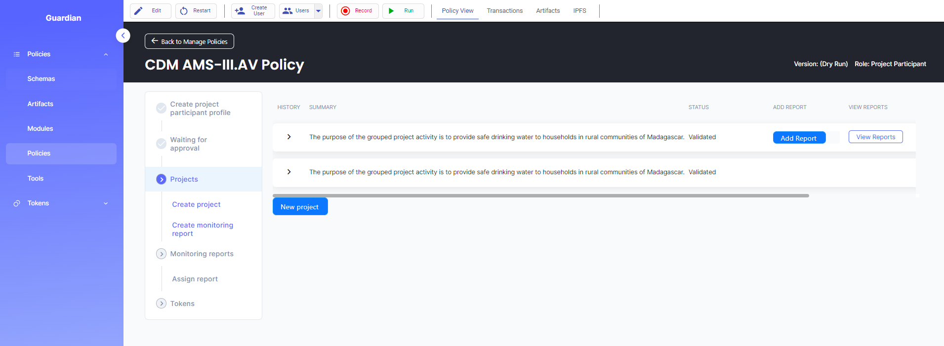 10. Log in as the Project Participant and create a monitoring report by clicking on the “Add Report” button then fill out the monitoring report form.
