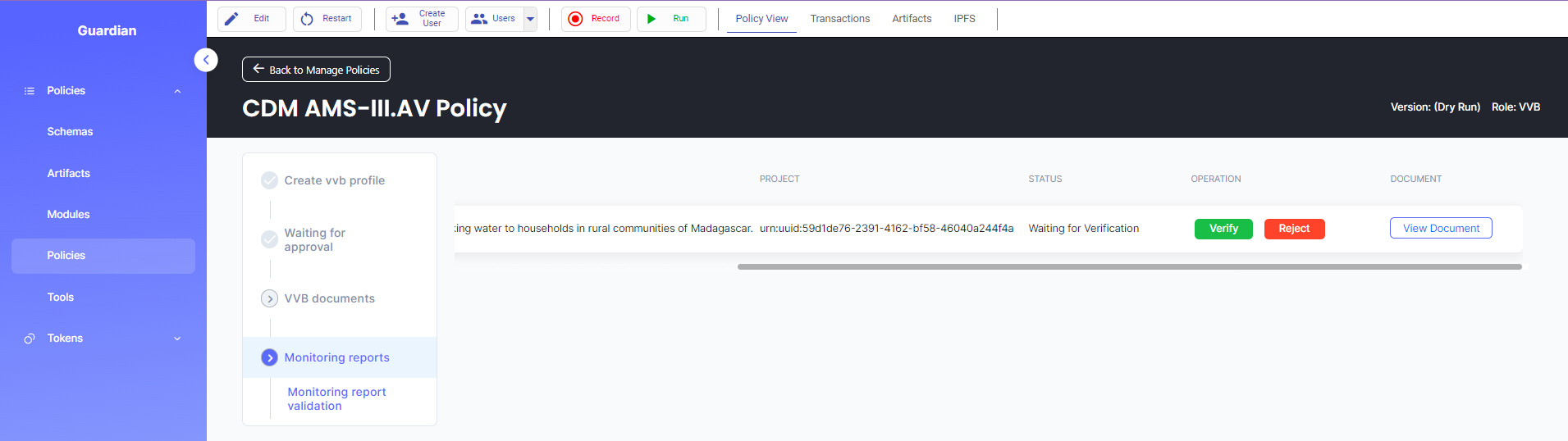 12. Log in as the VVB and click the “Monitoring Reports” tab to review the document submitted by the Project Participant. After reviewing the monitoring report by selecting “View Document”, the VVB can select “Verify”.