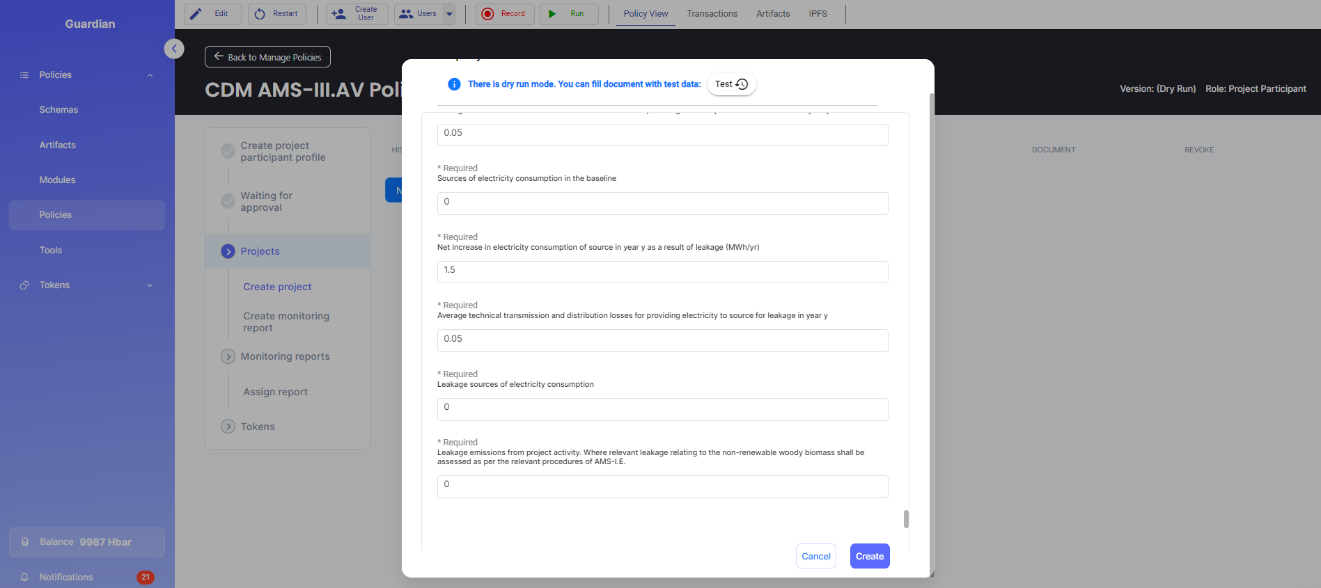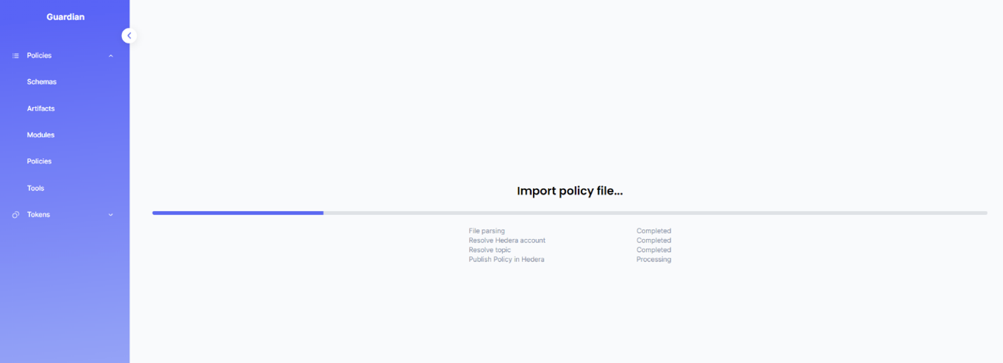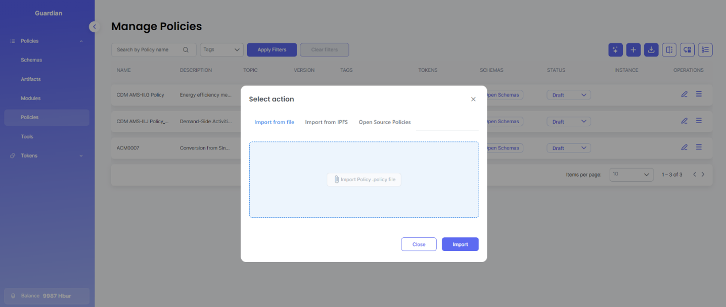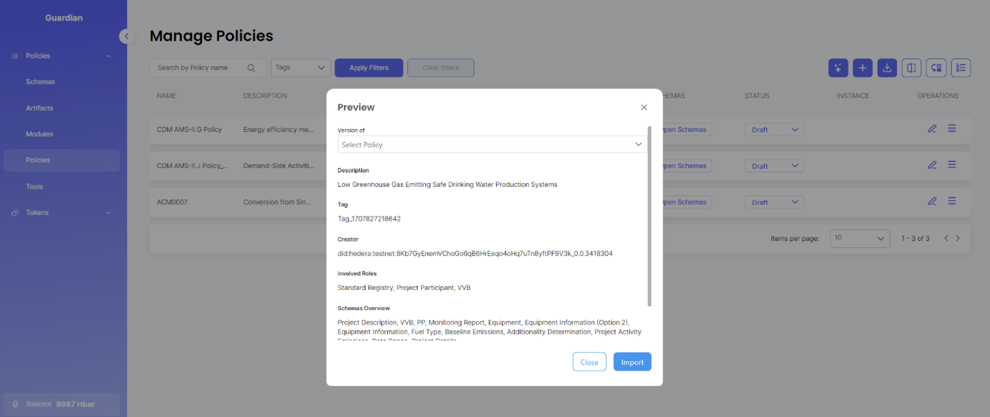 This policy is published to Hedera network and can either be imported via Github (.policy file) or IPFS timestamp.
