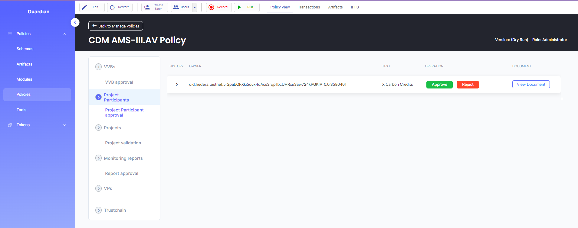 7. Log in as the SR and select the “Project Participant” or the “VVB” tab to view the documents submitted by the Project Participant and by the VVB. The SR can approve their requests by clicking on the “Approve" button.