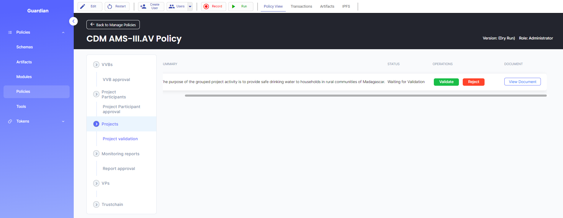 9. Log back in as the SR and after reviewing the document by selecting the “View Document” button, the SR can validate the project submitted by the Project Participant by clicking the “Validate” button. If the data does not satisfy the rules set by the SR, then the “Reject” button can be used.