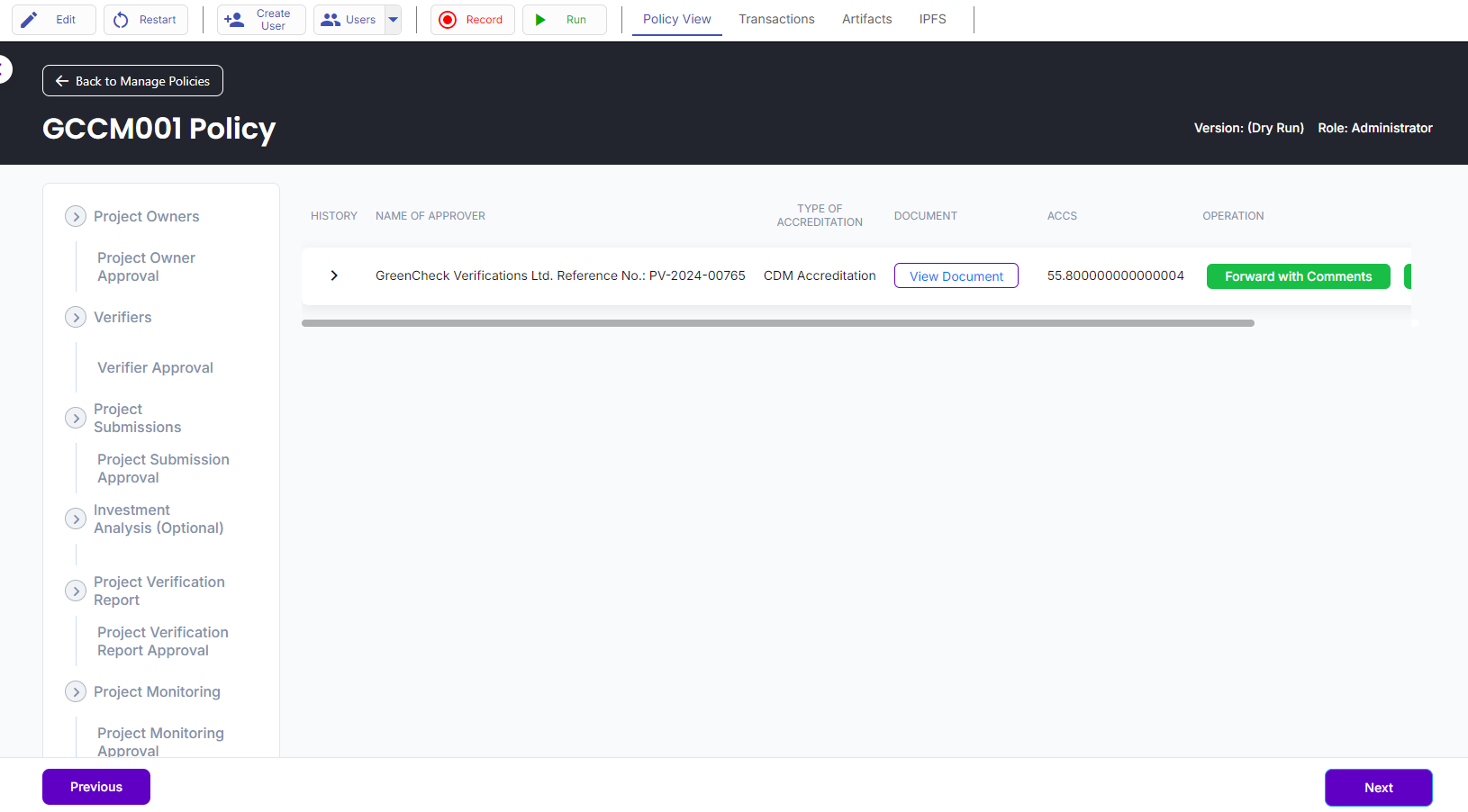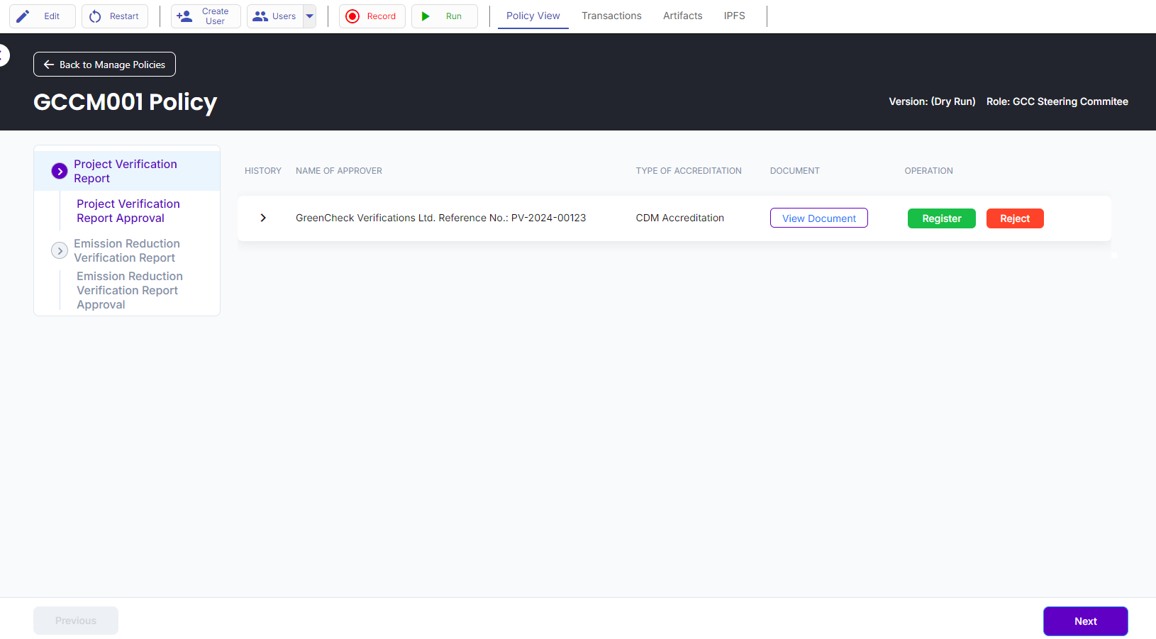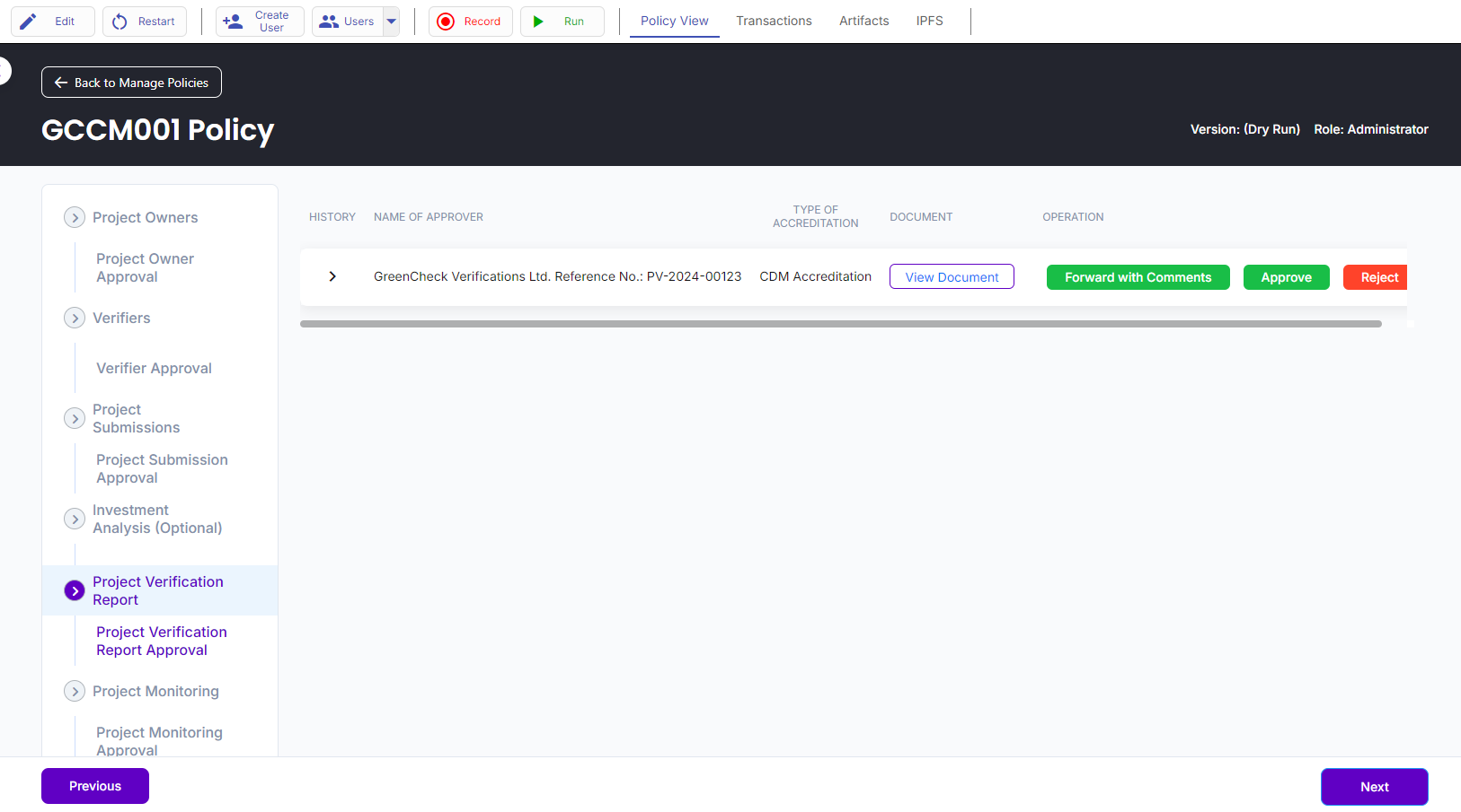 12. Log in as the Steering Committee and approve or reject the Project Verification Report. This approval will register the project. Any comments submitted by the administrator can be viewed by clicking on the history dropdown.