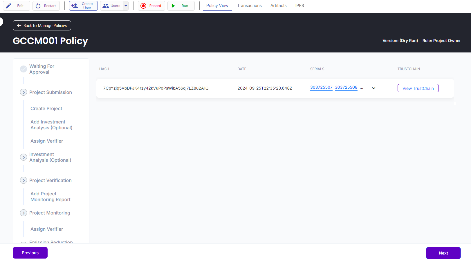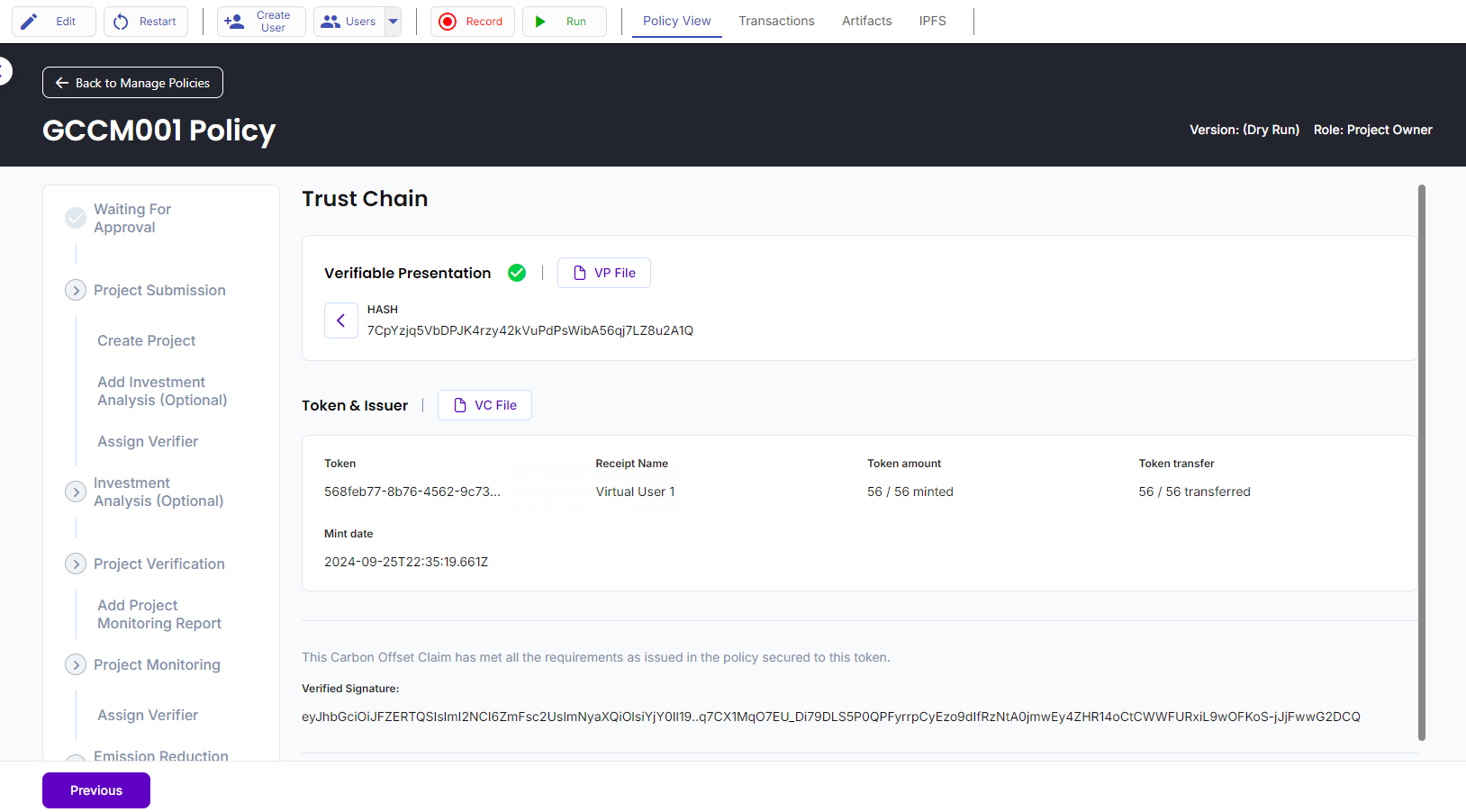 This policy is published to Hedera network and can either be imported via Github (.policy file) or IPFS timestamp.