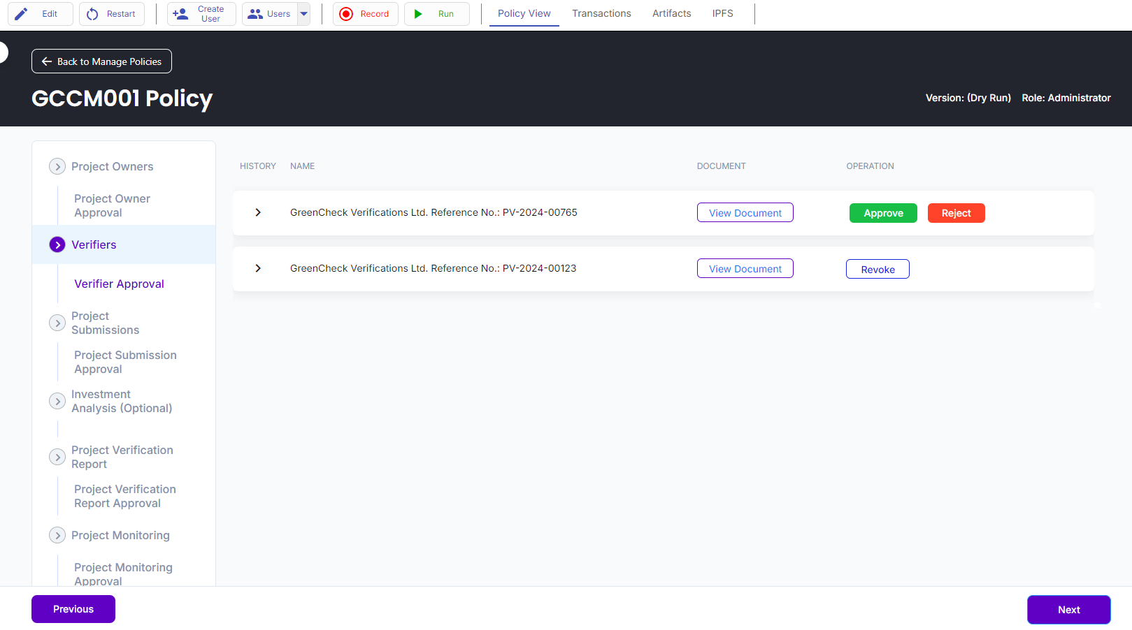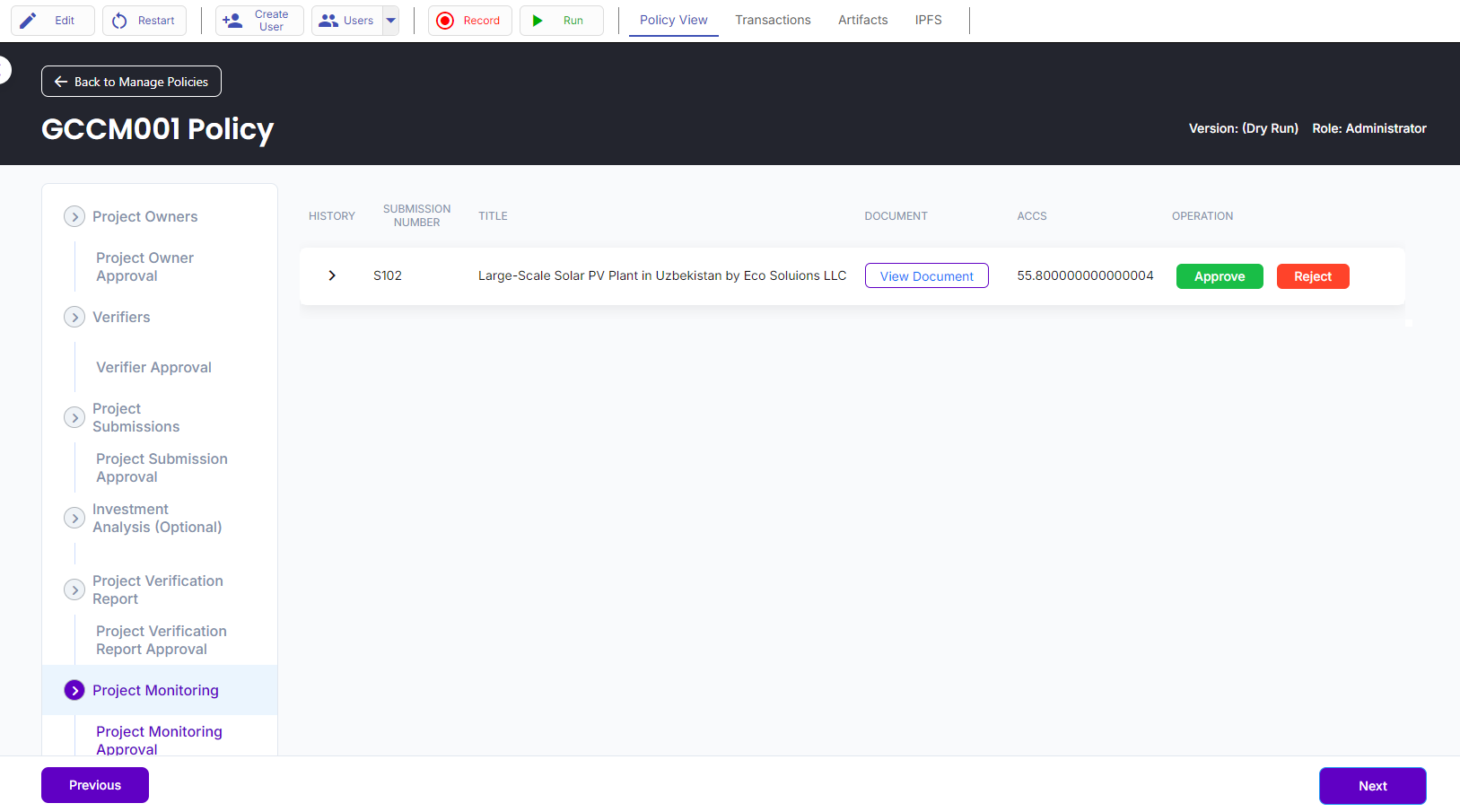 5. Log in to the administrator account to review and approve the Project Owner and Verifier accounts. The administrator will have access to the submitted registration forms for each user and can choose to approve or reject them.