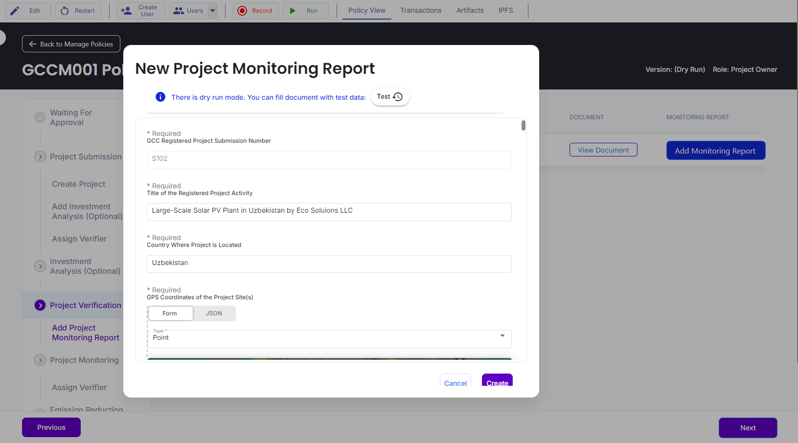 13. The project owner can now submit monitoring reports by clicking the monitoring report button and completing the form.